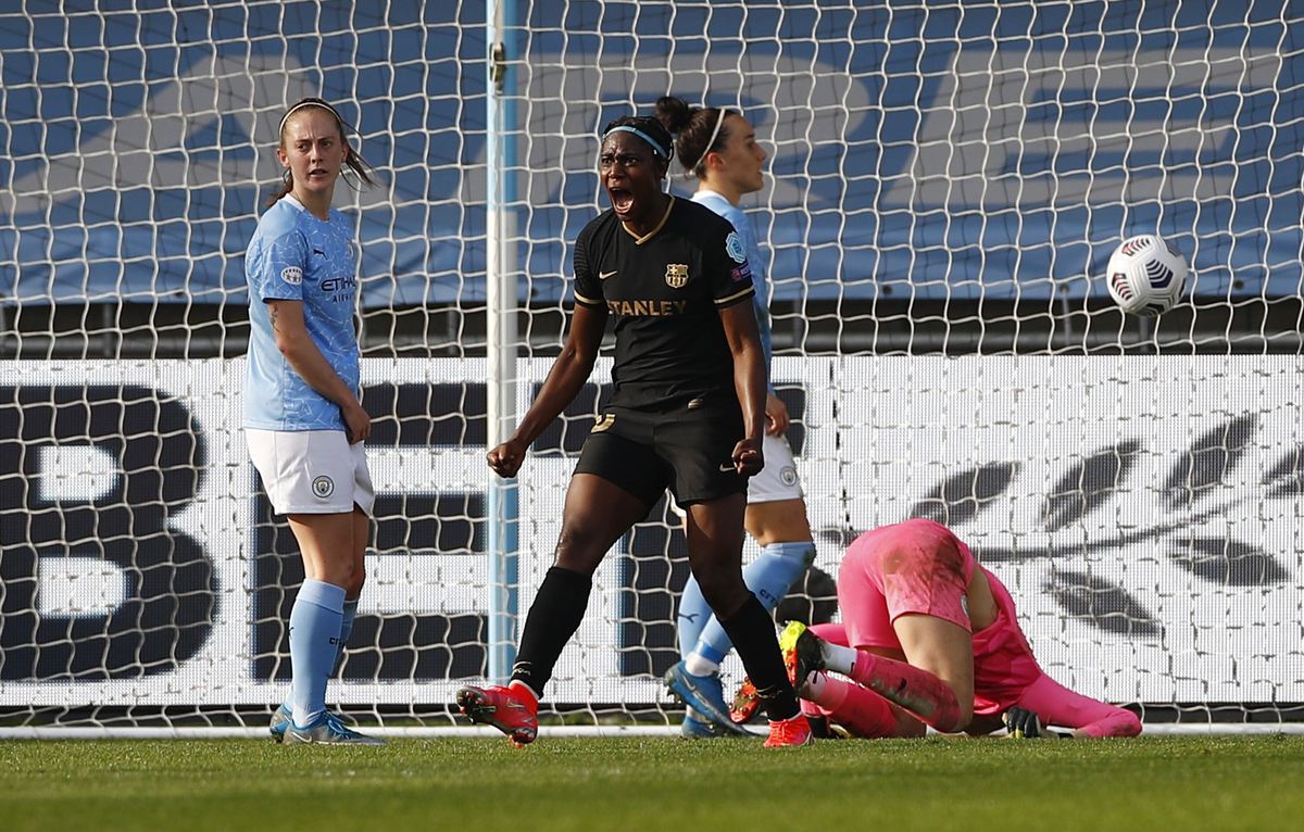 Soccer Football - Women's Champions League - Quarter Final - Second Leg - Manchester City v FC Barcelona - Manchester City Academy Stadium, Manchester, Britain - March 31, 2021 Barcelona's Asisat Oshoala celebrates scoring their first goal as Manchester City players look dejected Action Images via Reuters/Jason CairnduffSoccer Football - Women's Champions League - Quarter Final - Second Leg - Manchester City v FC Barcelona - Manchester City Academy Stadium, Manchester, Britain - March 31, 2021 Manchester City's Janine Beckie celebrates scoring their first goal with teammates Action Images via Reuters/Jason Cairnduff