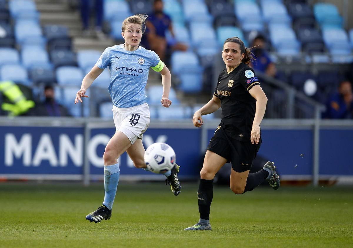 Soccer Football - Women's Champions League - Quarter Final - Second Leg - Manchester City v FC Barcelona - Manchester City Academy Stadium, Manchester, Britain - March 31, 2021 Barcelona's Andreas Pereira in action with Manchester City's Ellen White Action Images via Reuters/Jason Cairnduff