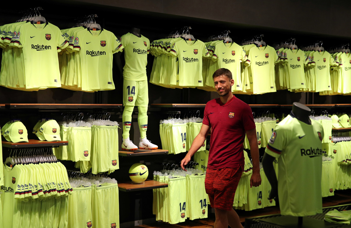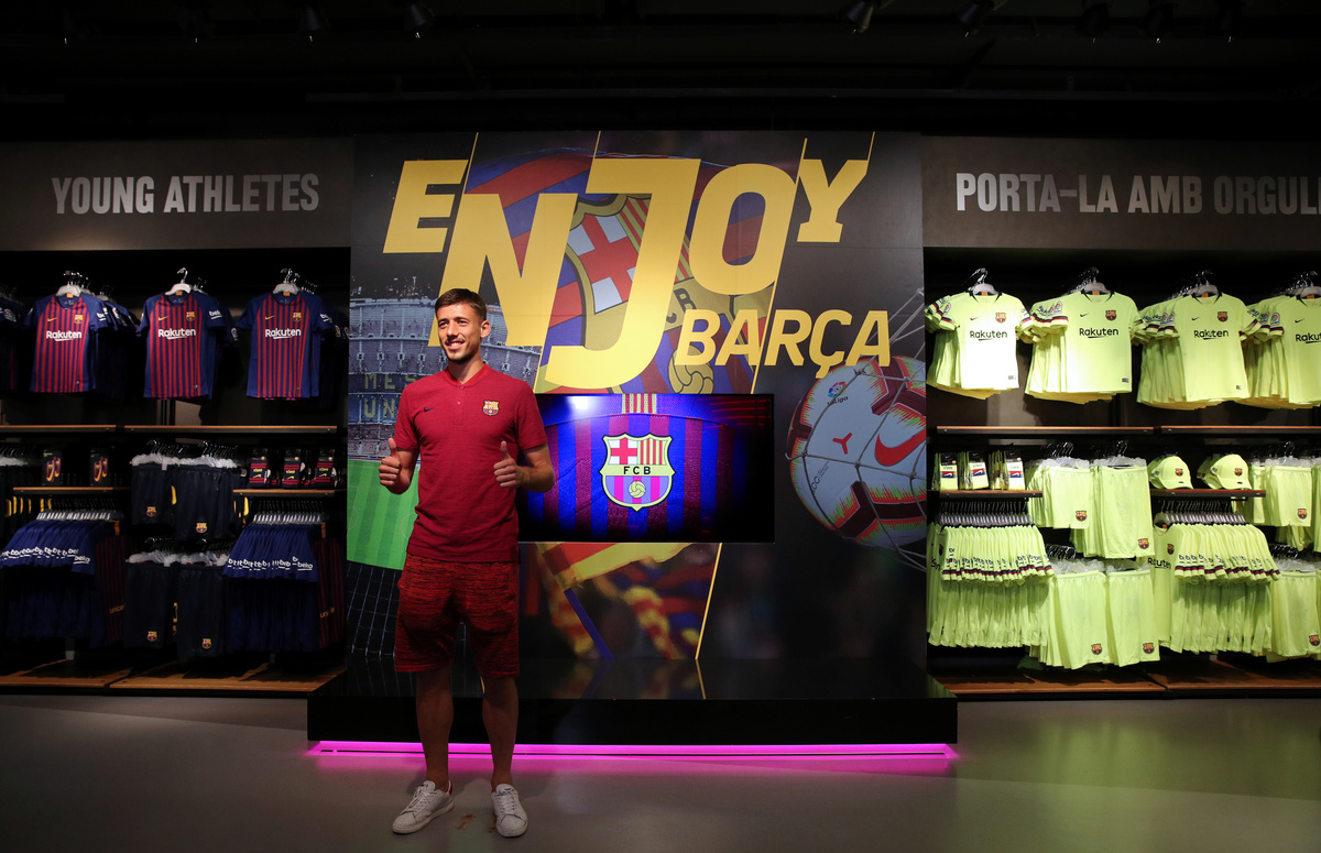 French soccer player Clement Lenglet poses in a FC Barcelona's shop next to Camp Nou stadium in Barcelona, Spain July 12, 2018. REUTERS/Albert GeaFrench soccer player Clement Lenglet arrives at a FC Barcelona's shop for a photocall next to Camp Nou stadium in Barcelona, Spain July 12, 2018. REUTERS/Albert Gea