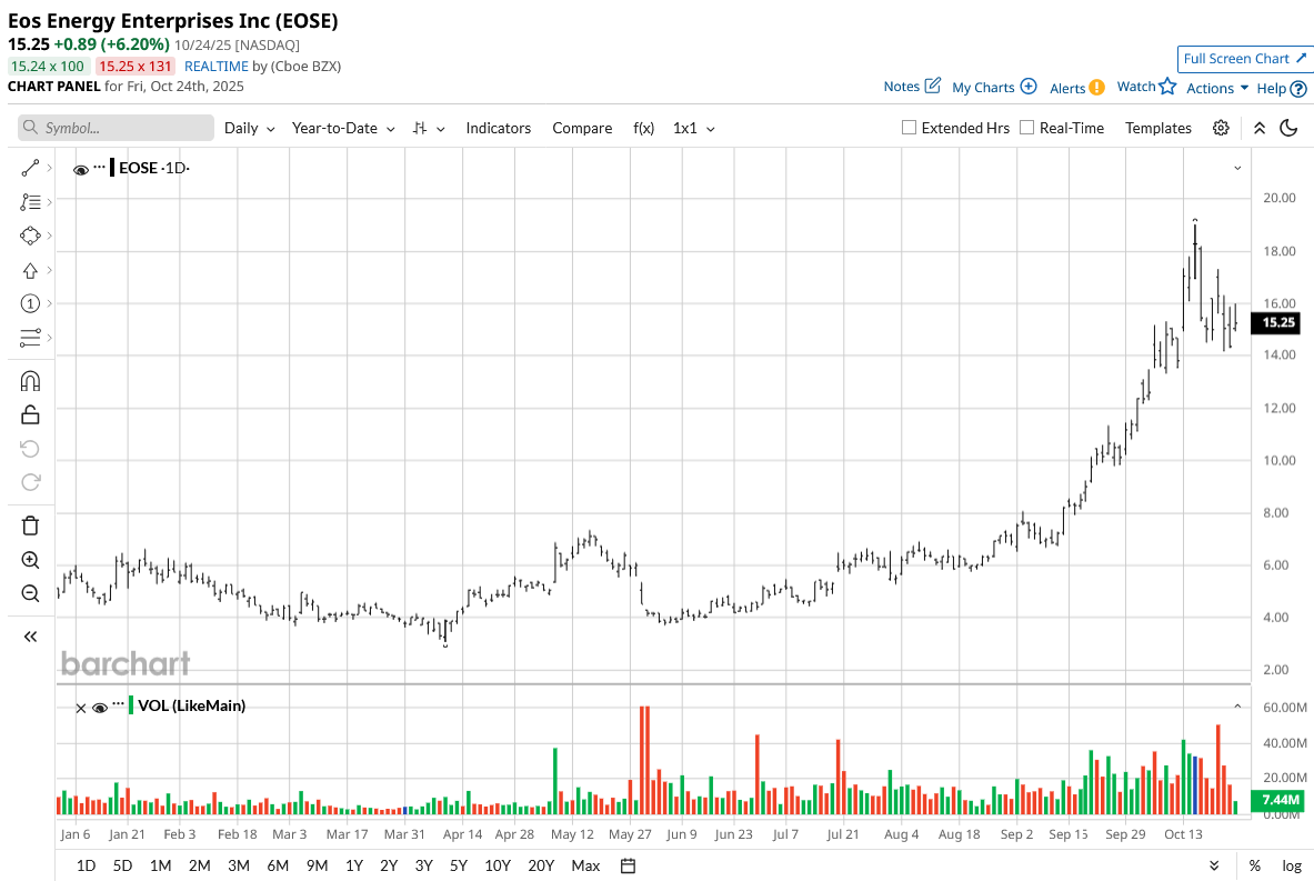 EOSE stock has surged 220% year-to-date (YTD), far outperforming the S&P 500 Index’s ($SPX) ~11% gain. Shares have traded between $2.06 and $19.05 over the past 52 weeks, recently changing hands around $15.25.