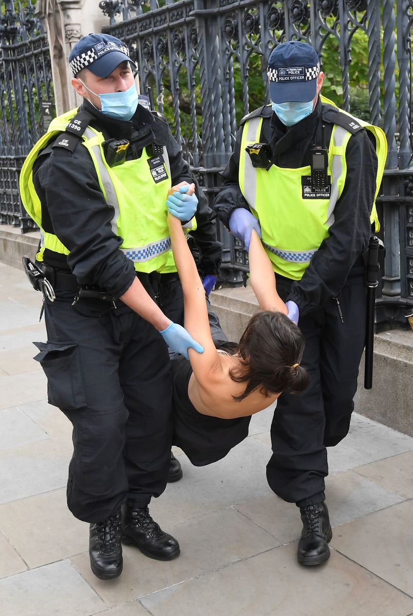 Thirty bare-chested women locked themselves to the railings outside Britain's Houses of Parliament on Thursday in an Extinction Rebellion protest to demand action against climate change.