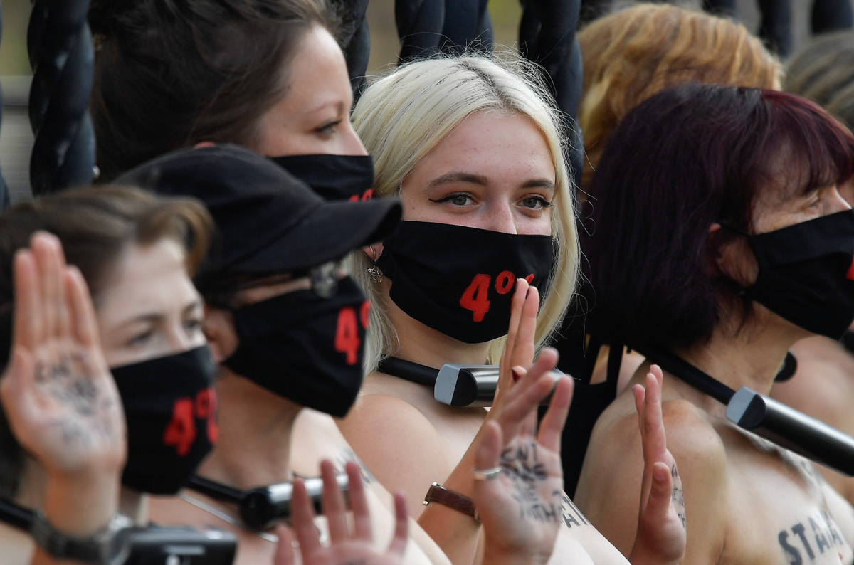 The women carried a large banner reading "Can't bare the truth?" and had words painted on their chests representing predicted consequences of global warming such as war, drought, starvation, wildfires, violence and famine.