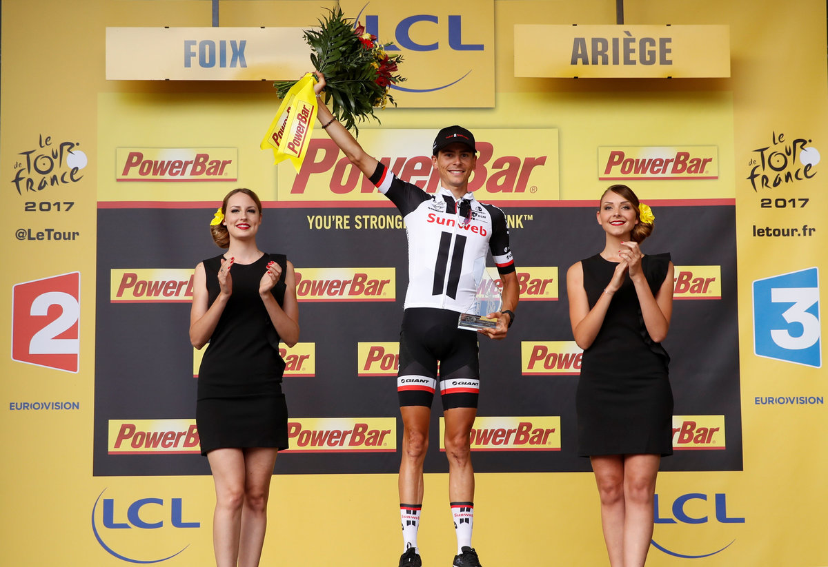 The leading duo were caught by Barguil and Quintana just before the summit of the Mur de Peguere and the Frenchman, who strengthened his grip on the polka dot jersey, proved the stronger sprinter.