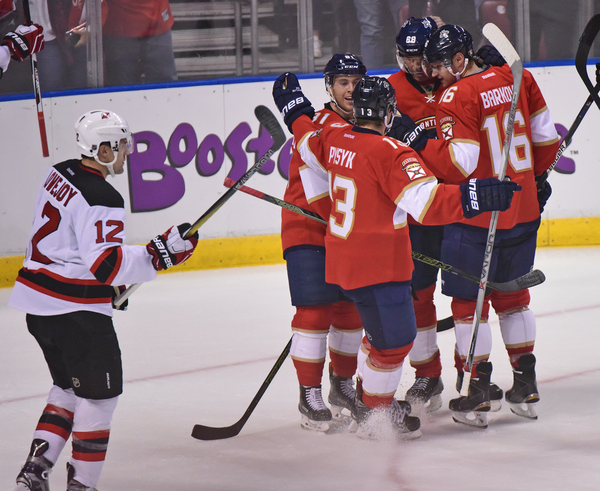 Just 2:12 into overtime, Panthers rookie defenseman Mike Matheson tossed Devils defenseman Damon Severson to the ice before whizzing a pass across the goal-mouth to Barkov for the one-timer. Down came the plastic rats from high atop the arena where three hours earlier the Panthers' Atlantic Division championship banner was dropped down amidst a puff of smoke.