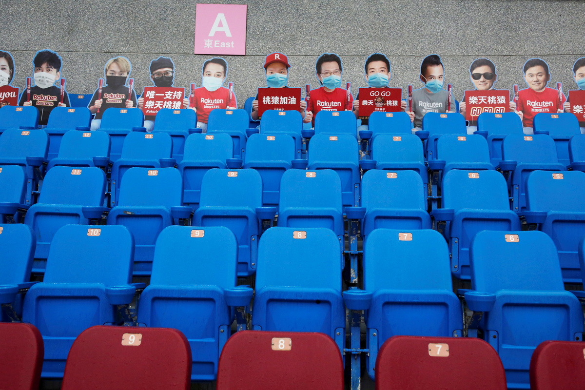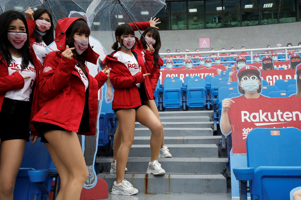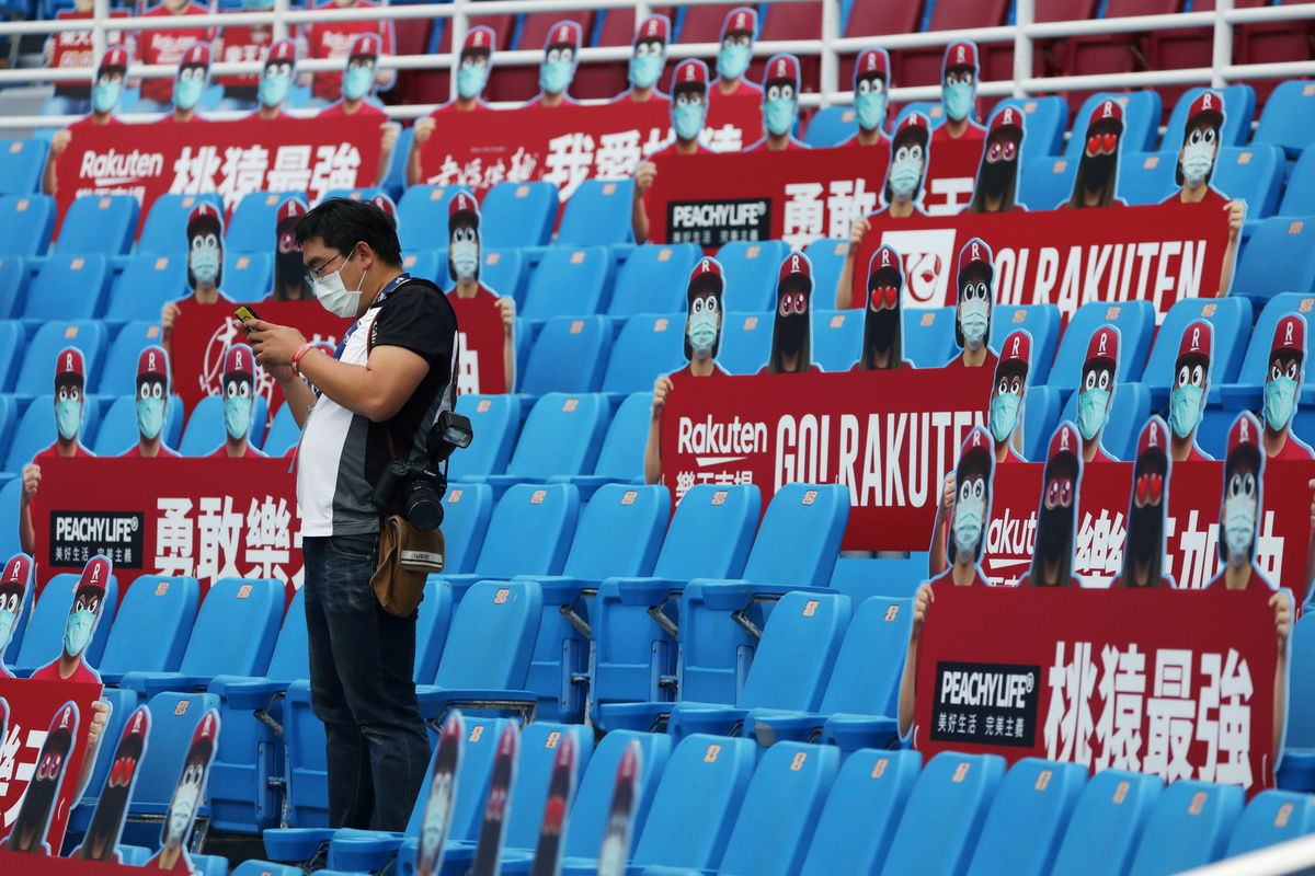 Rakuten Monkeys had placed cardboard cut-outs of fans replete with face masks in the stands for the washed-out game on Saturday, while anyone entering the baseball stadiums had their temperatures checked.