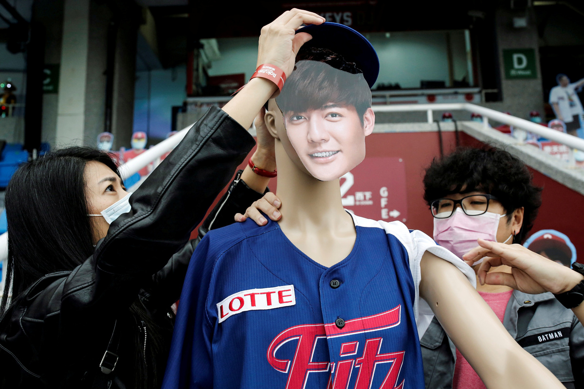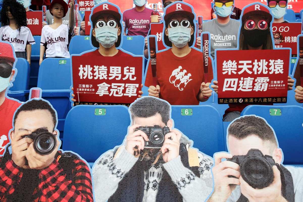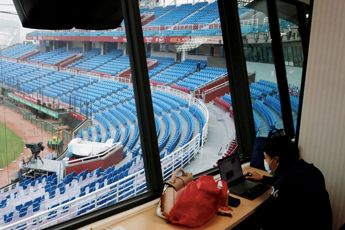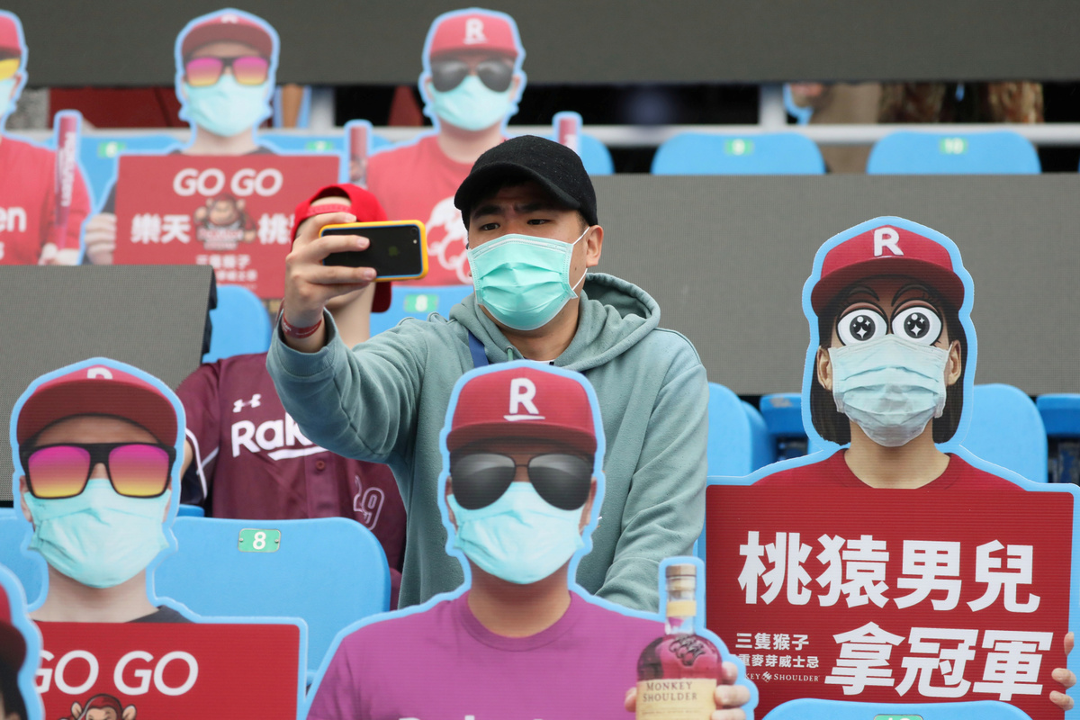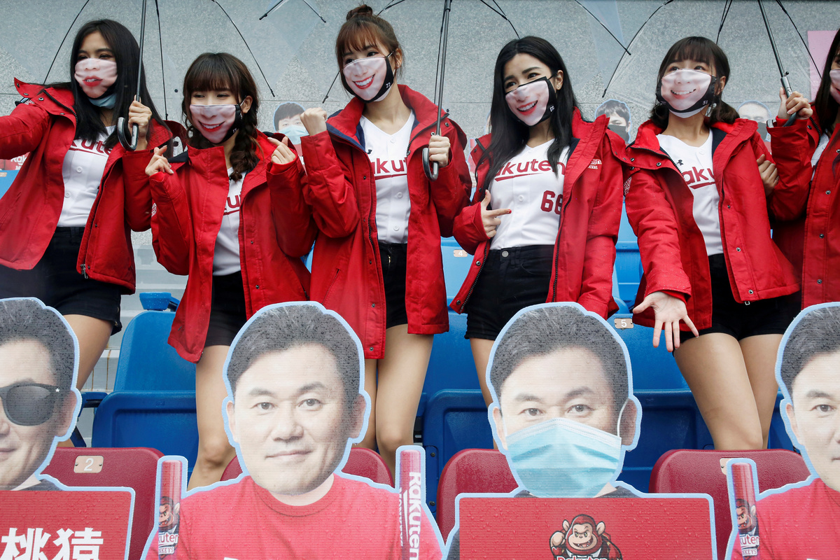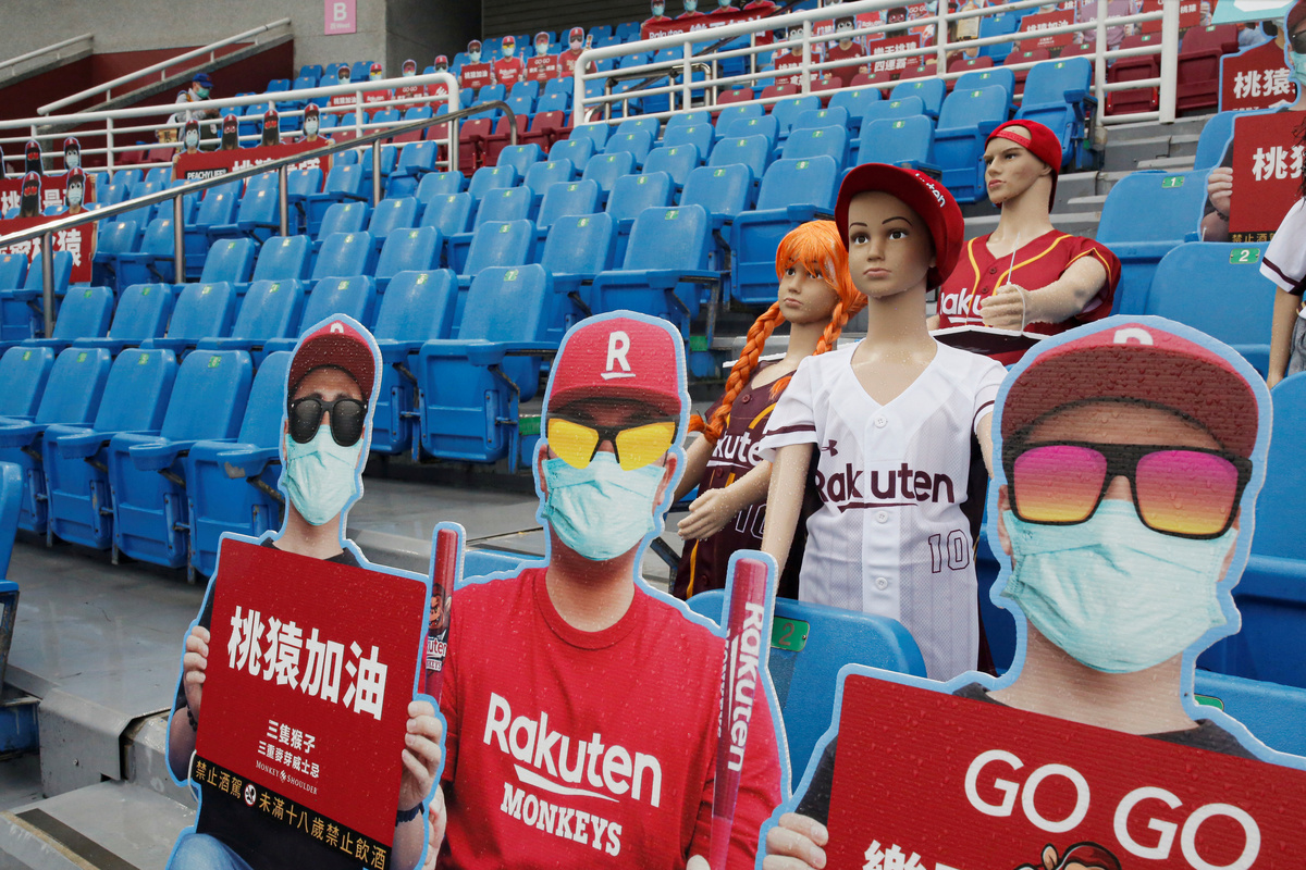 Dummies replaced audience due to the outbreak of the coronavirus disease (COVID-19) at the first professional baseball league game of the season at Taoyuan International baseball stadium in Taoyuan city, Taiwan, April 11, 2020. REUTERS/Ann WangCheerleaders wearing face masks due to the outbreak of the coronavirus disease (COVID-19) are seen at the first professional baseball league game of the season at Taoyuan International baseball stadium in Taoyuan city, Taiwan, April 11, 2020. REUTERS/Ann WangStaff work on one of a dummy replacing audience due to the outbreak of the coronavirus disease (COVID-19) at the first professional baseball league game of the season at Taoyuan International baseball stadium in Taoyuan city, Taiwan, April 11, 2020. REUTERS/Ann WangDummies replaced audience due to the outbreak of the coronavirus disease (COVID-19) at the first professional baseball league game of the season at Taoyuan International baseball stadium in Taoyuan city, Taiwan, April 11, 2020. REUTERS/Ann WangA man takes a selfie with the dummies that are used as replacements of the audience due to the outbreak of the coronavirus disease (COVID-19) at the first professional baseball league game of the season at Taoyuan International baseball stadium in Taoyuan city, Taiwan, April 11, 2020. REUTERS/Ann WangA reporter waits for the game to start at an empty stadium as no audience are allowed in due to the outbreak of the coronavirus disease (COVID-19) at the first professional baseball league game of the season at Taoyuan International baseball stadium in Taoyuan city, Taiwan, April 11, 2020. REUTERS/Ann WangCheerleaders wearing face masks due to the outbreak of the coronavirus disease (COVID-19) are seen at the first professional baseball league game of the season at Taoyuan International baseball stadium in Taoyuan city, Taiwan, April 11, 2020. REUTERS/Ann WangDummies replaced audience due to the outbreak of the coronavirus disease (COVID-19) at the first professional baseball league game of the season at Taoyuan International baseball stadium in Taoyuan city, Taiwan, April 11, 2020. REUTERS/Ann Wang