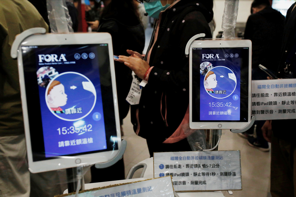 Machines to measure temperature are pictured at the entrance of the stadium due to the outbreak of the coronavirus disease (COVID-19) at Taoyuan International baseball stadium in Taoyuan city, Taiwan, April 11, 2020. REUTERS/Ann Wang