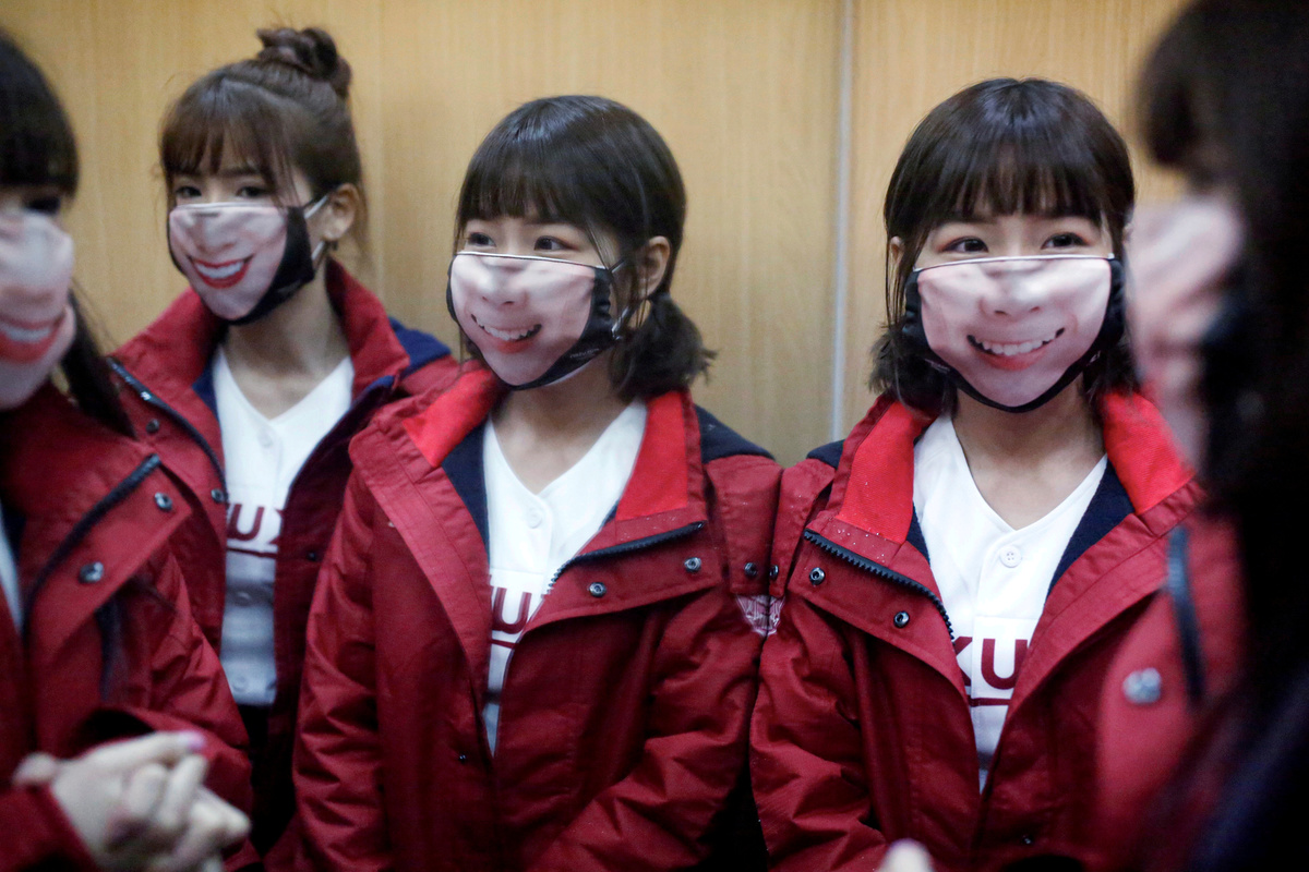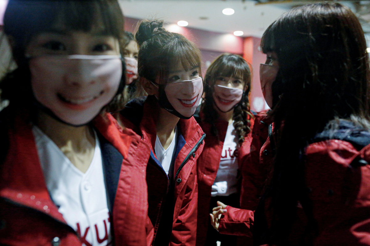 Cheerleaders take group photos with face mask on due to the outbreak of the coronavirus disease (COVID-19) at the first professional baseball league game of the season at Taoyuan International baseball stadium in Taoyuan city, Taiwan, April 11, 2020. REUTERS/Ann Wang