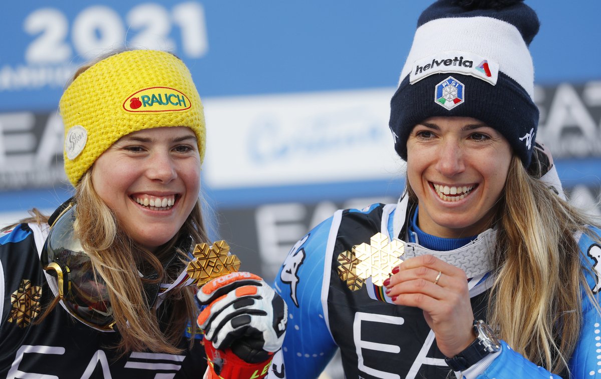 Marta Bassino shared an historic women's parallel gold with Austrian Katharina Liensberger at the Alpine skiing world championships on Tuesday, as hosts Italy celebrated their first medal since the competition began last Thursday.