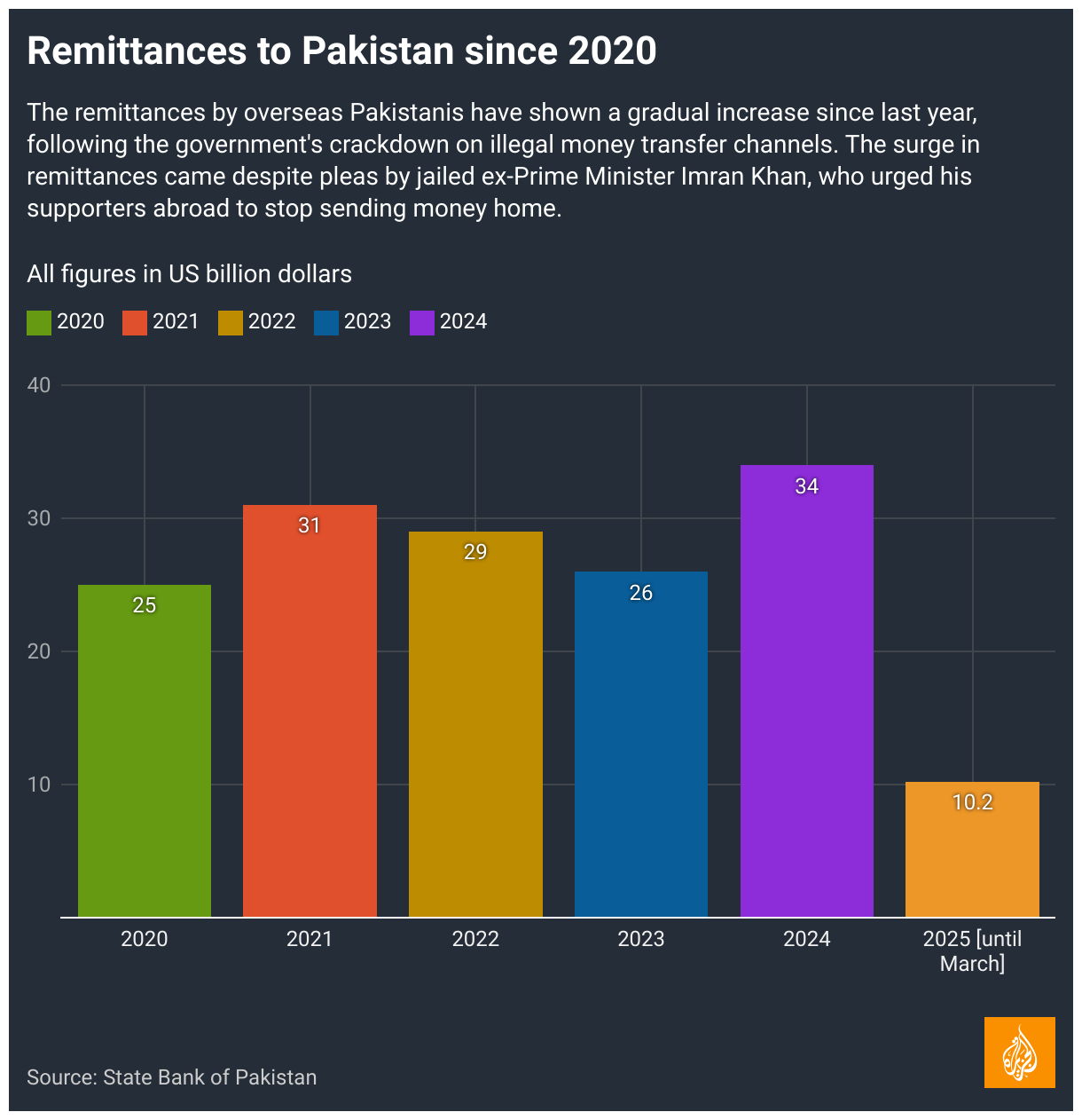 But 2024 saw Pakistan receive the highest annual remittance amount in its history, reaching $34.1bn, a 32 percent increase from 2023, when overseas Pakistanis sent home close to $26bn.