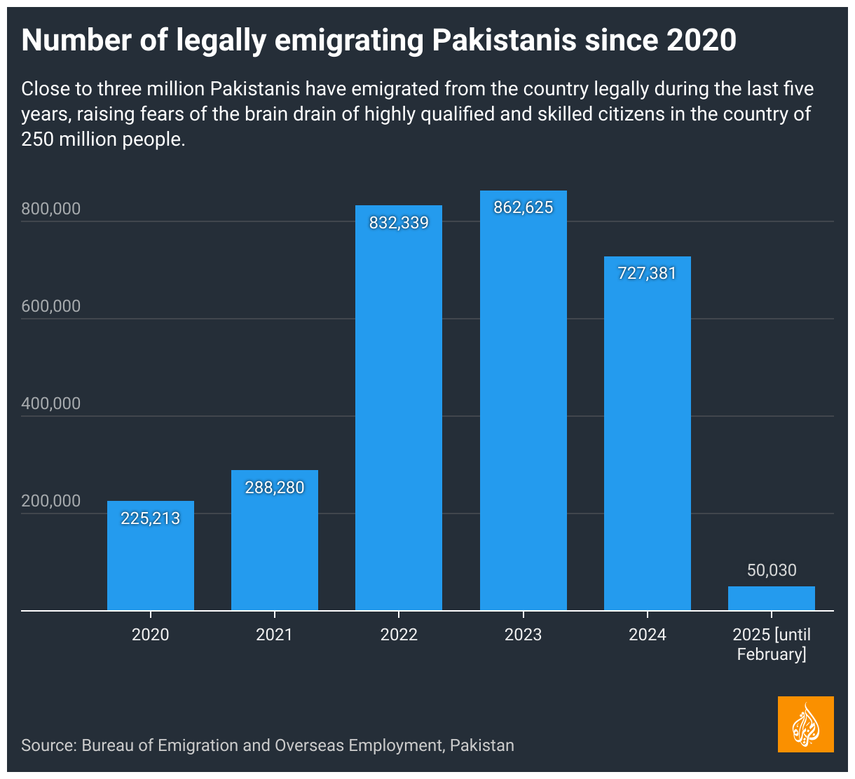 In the last five years, nearly three million Pakistanis have emigrated, according to government data, prompting growing concerns about a “brain drain” from the country.