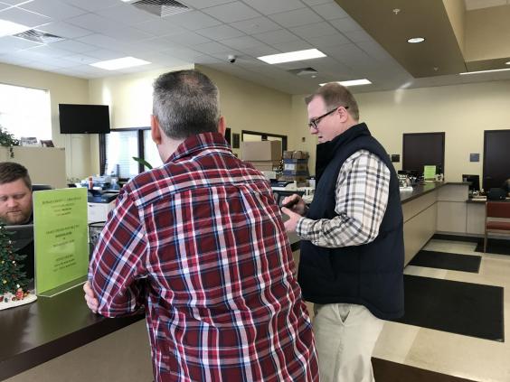 Which explains why every time he steps into this office, even for something like a car registration, there is a frisson in the air. Ms Davis is out on this particular afternoon, but her son, Nathan Davis, is there. He waves gingerly from his desk, above which hangs a large wooden sign declaring: “PRAY ALWAYS, WORK HARD, TRUST GOD”. That will have to go, if Mr Ermold wins.