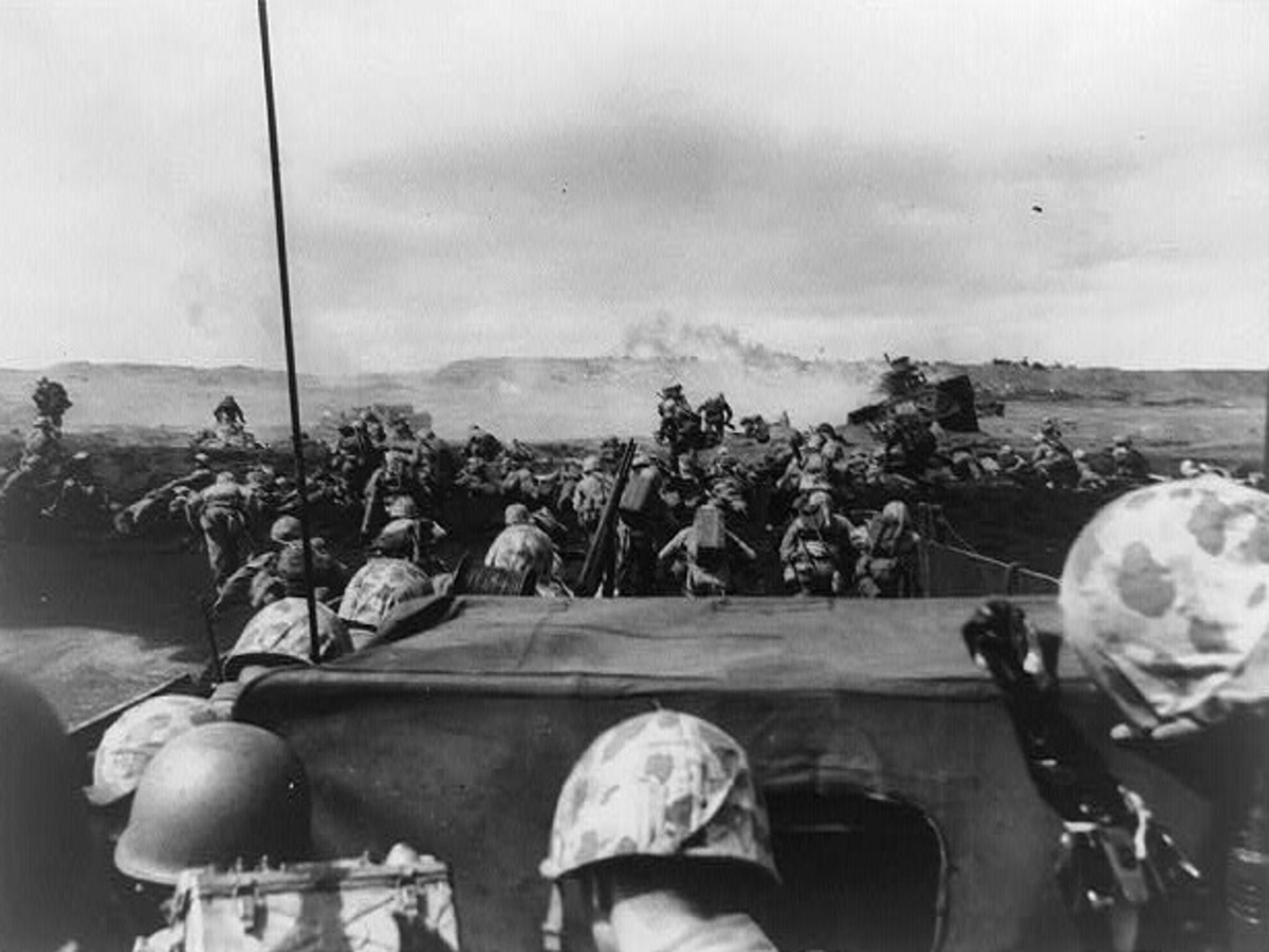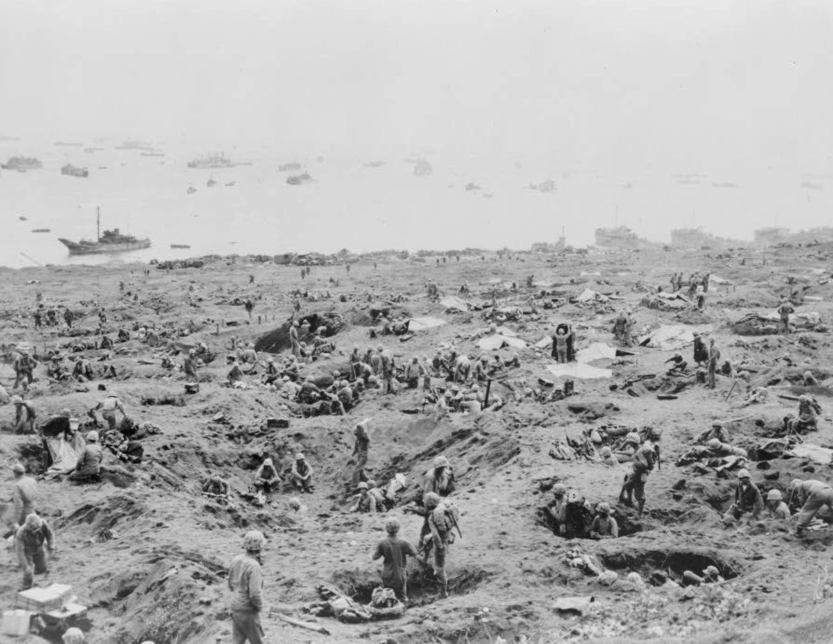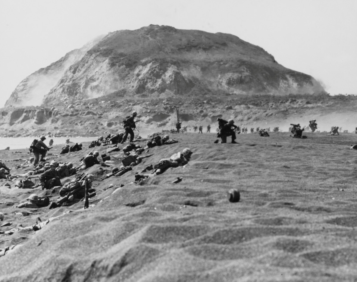 U.S. Marines with the Fifth Division move inland off the landing beach after coming ashore on Iwo Jima, February 19, 1945. Mount Suribachi is in the background. Courtesy U.S. Naval History and Heritage/U.S Marine Corps Photograph/Bob Campbell/Handout via REUTERS