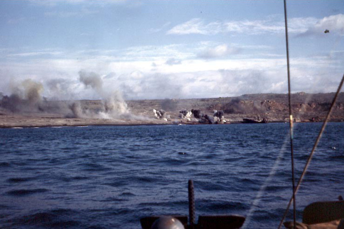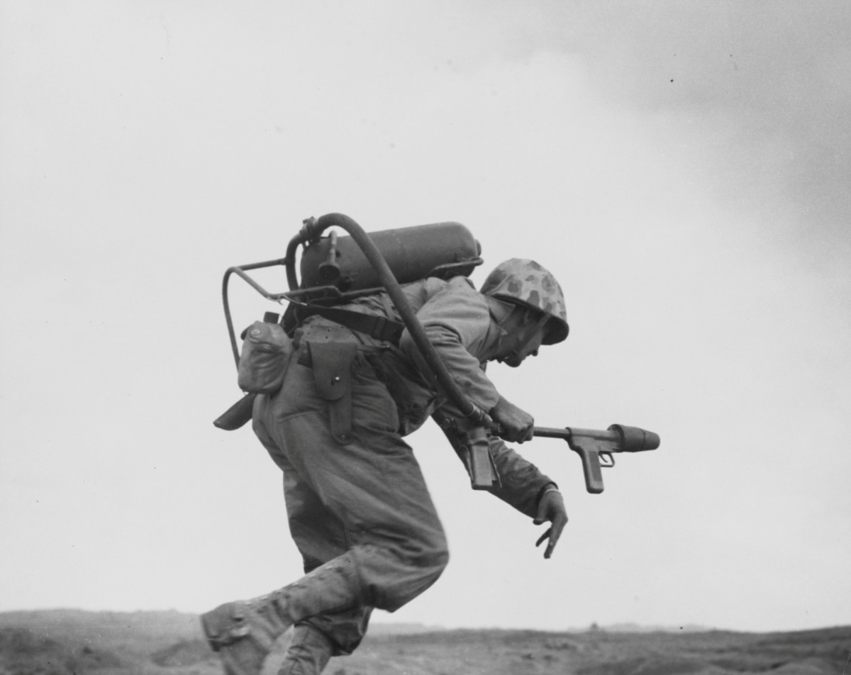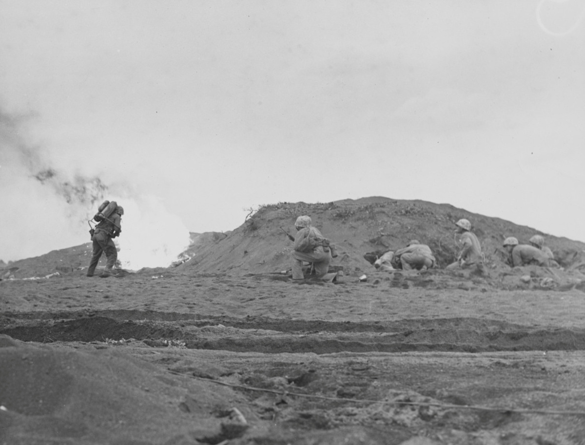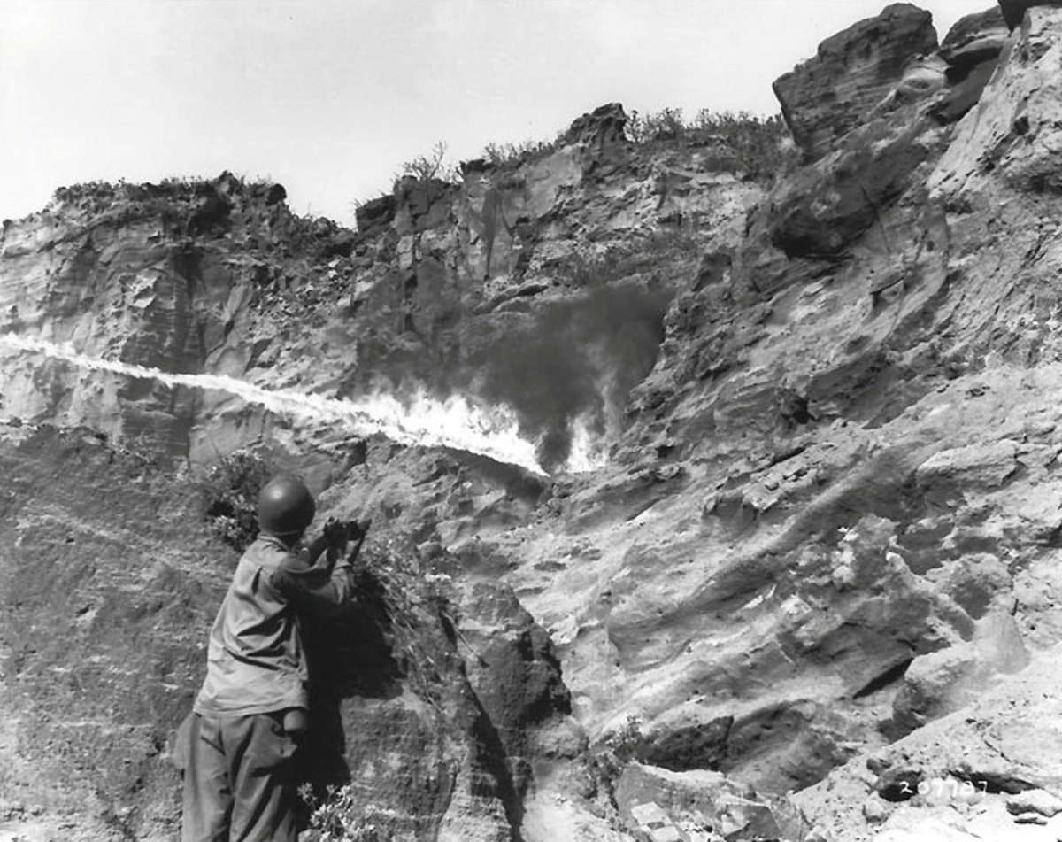 White phosphorus was used in the pre-invasion bombardment and U.S. troops wielded flame-throwers during the battle.