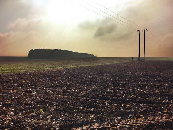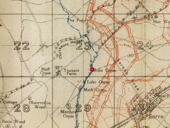 I travel to Serre Road No2 military cemetery. It is the biggest in the area, containing 7,127 British and Commonwealth graves, of which 4,944 are unidentified. I have arranged to meet The Independent's Paris correspondent John Lichfield here. He knows the Somme battlefields well and will walk with me to the spot where my father was wounded. He takes me up the road and along a track to the trees known as John Copse and we stop to examine the 1916 trench map. "This is most likely it," says John. I look out at the ploughed land. Bare and brown and cold.