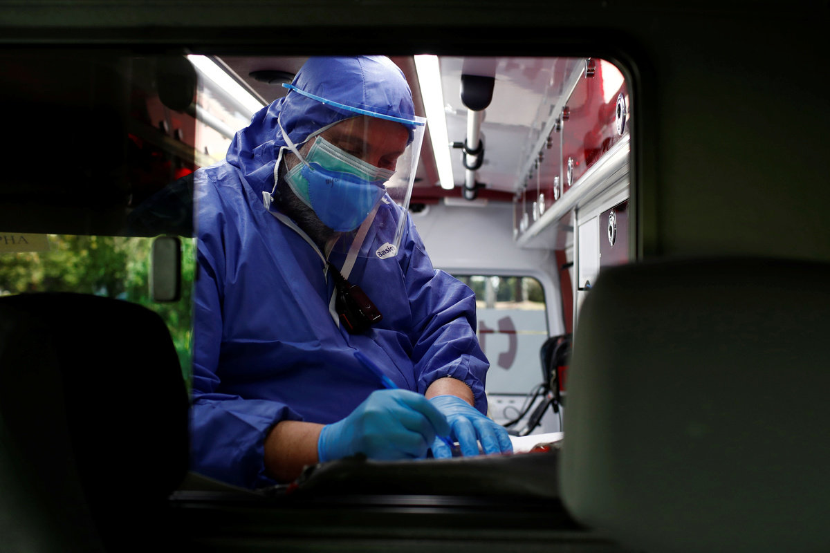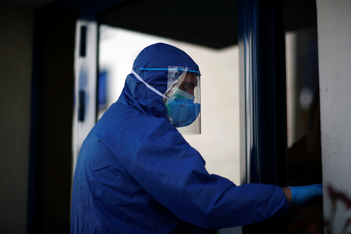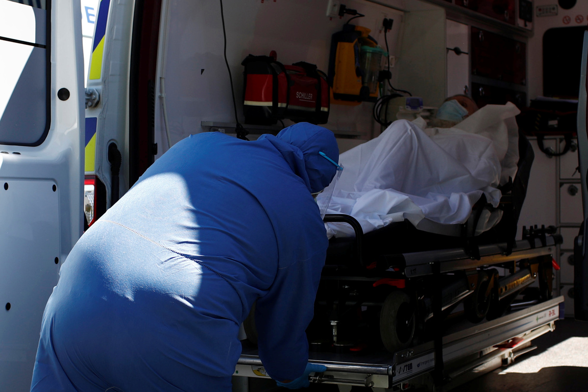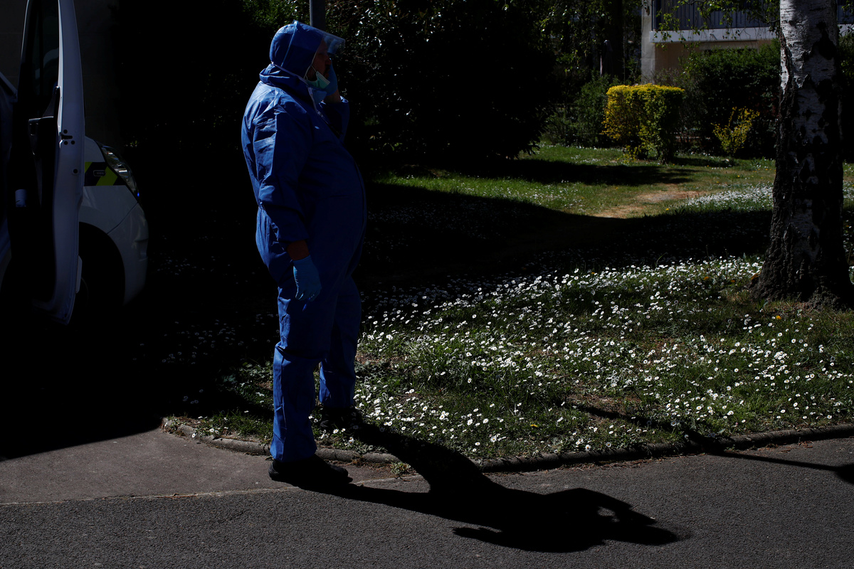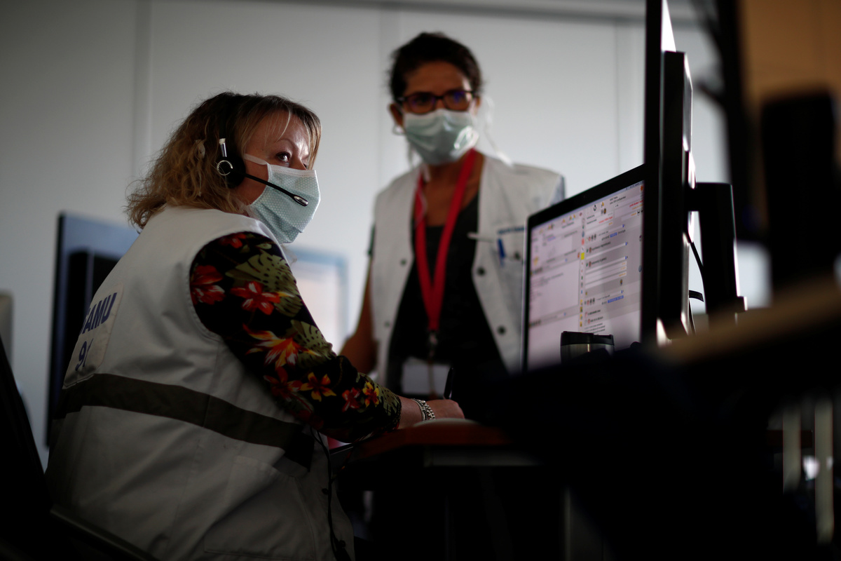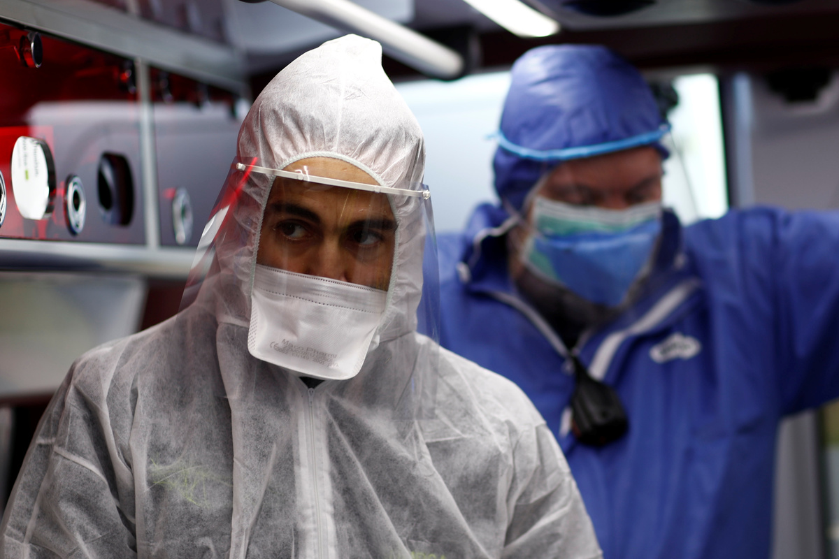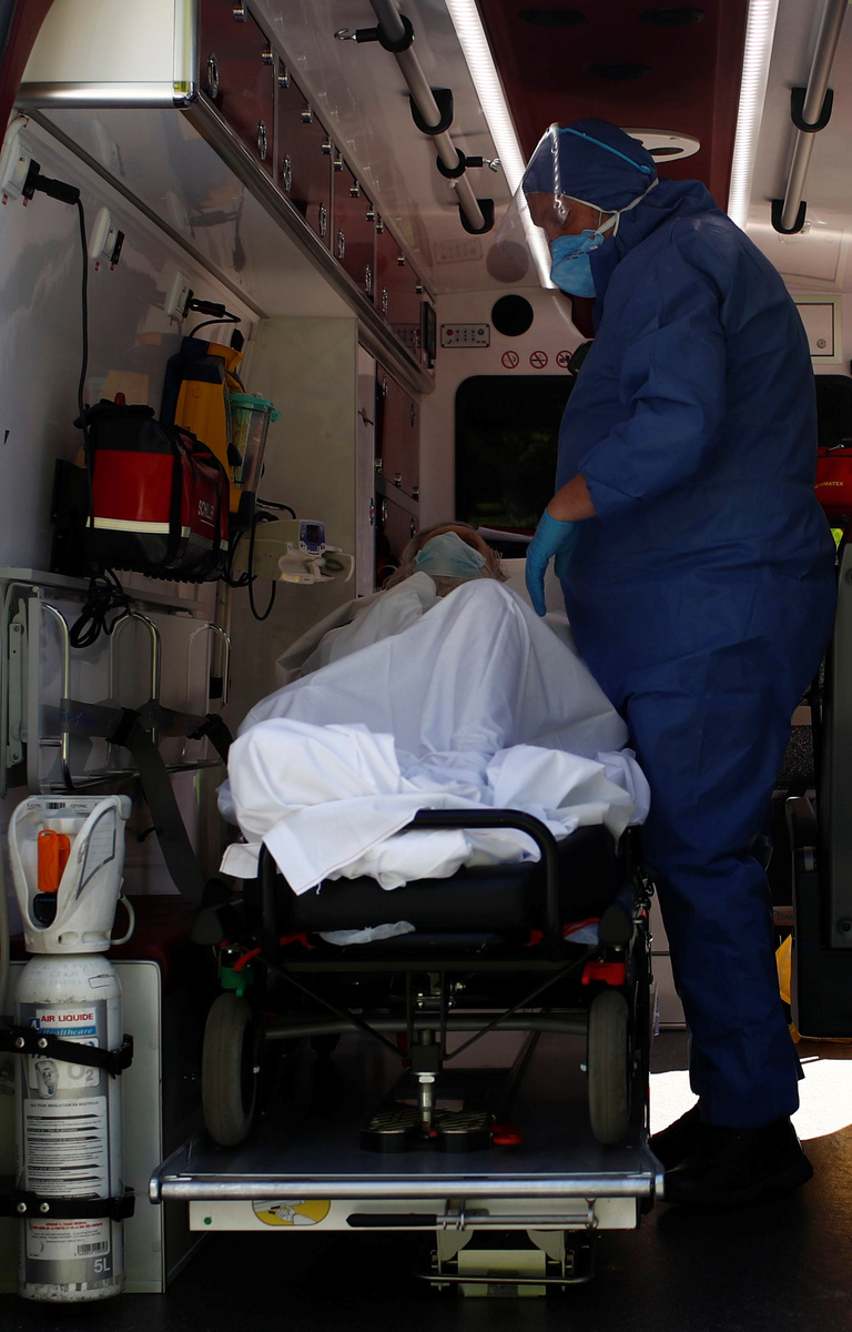 French ambulance men, wearing protective suits and masks, transport to an hospital a man suspected of being infected with the coronavirus disease in their ambulance in Mennecy near Paris as the spread of the coronavirus disease (COVID-19) continues in France April 15, 2020. REUTERS/Gonzalo FuentesA French ambulance man, wearing protective suit and mask, transports to an hospital a man suspected of being infected with the coronavirus disease in their ambulance in Mennecy near Paris as the spread of the coronavirus disease (COVID-19) continues in France April 15, 2020. REUTERS/Gonzalo FuentesA French ambulance man, wearing protective suit and mask, gets ready before to transport to an hospital a man suspected of being infected with the coronavirus disease in Mennecy near Paris as the spread of the coronavirus disease (COVID-19) continues in France April 15, 2020. REUTERS/Gonzalo FuentesA French ambulance man, wearing protective suit and mask, transports a man suspected of being infected with the coronavirus disease at the Sud Francilien hospital in Corbeil-Essonne near Paris as the spread of the coronavirus disease (COVID-19) continues in France April 15, 2020. REUTERS/Gonzalo FuentesA French ambulance man, wearing protective suit and mask, talks to a man suspected of being infected with the coronavirus disease in an ambulance as they arrive at the Sud Francilien hospital in Corbeil-Essonne near Paris as the spread of the coronavirus disease (COVID-19) continues in France April 15, 2020. REUTERS/Gonzalo FuentesA French ambulance man, wearing protective suit and mask, gets ready before to transport to an hospital a man suspected of being infected with the coronavirus disease in Mennecy near Paris as the spread of the coronavirus disease (COVID-19) continues in France April 15, 2020. REUTERS/Gonzalo FuentesAn ambulance transports a man suspected of being infected with the coronavirus disease at the Sud Francilien hospital in Corbeil-Essonne near Paris as the spread of the coronavirus disease (COVID-19) continues in France April 15, 2020. REUTERS/Gonzalo FuentesA French ambulance man disinfects an ambulance after transporting a man suspected of being infected with the coronavirus disease at the Sud Francilien hospital in Corbeil-Essonne near Paris as the spread of the coronavirus disease (COVID-19) continues in France April 15, 2020. REUTERS/Gonzalo FuentesA French ambulance man, wearing protective suit and mask, makes a phone call before to transport to an hospital a man suspected of being infected with the coronavirus disease in Mennecy near Paris as the spread of the coronavirus disease (COVID-19) continues in France April 15, 2020. REUTERS/Gonzalo FuentesA French ambulance man, wearing protective suit and mask, talks to a man suspected of being infected with the coronavirus disease in an ambulance as they arrive at the Sud Francilien hospital in Corbeil-Essonne near Paris as the spread of the coronavirus disease (COVID-19) continues in France April 15, 2020. REUTERS/Gonzalo FuentesA French ambulance man disinfects an ambulance after transporting a man suspected of being infected with the coronavirus disease at the Sud Francilien hospital in Corbeil-Essonne near Paris as the spread of the coronavirus disease (COVID-19) continues in France April 15, 2020. REUTERS/Gonzalo FuentesMedical staff, wearing protective face masks, work in an emergency call center for coronavirus disease (COVID-19) patients in Evry near Paris as the spread of the coronavirus disease continues in France, April 15, 2020.REUTERS/Gonzalo FuentesMedical staff, wearing protective face masks, work in an emergency call center for coronavirus disease (COVID-19) patients in Evry near Paris as the spread of the coronavirus disease continues in France, April 15, 2020.REUTERS/Gonzalo FuentesA nurse takes a break next to parking lot for ambulance at the Sud Francilien hospital in Corbeil-Essonne near Paris as the spread of the coronavirus disease (COVID-19) continues in France April 15, 2020. REUTERS/Gonzalo FuentesMedical staff, wearing protective face masks, work in an emergency call center for coronavirus disease (COVID-19) patients in Evry near Paris as the spread of the coronavirus disease continues in France, April 15, 2020.REUTERS/Gonzalo Fuentes