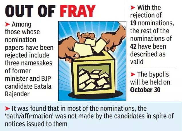 Among those whose nomination papers have been rejected include three namesakes of former minister and BJP candidate Eatala Rajender. With the rejection of 19 nominations, the rest of the nominations of 42 have been described as valid. The bypolls will be held on October 30. In the instance of Sharagundla Manyam who entered the fray as an independent, names of all 10 proposers did not tally with electoral rolls.