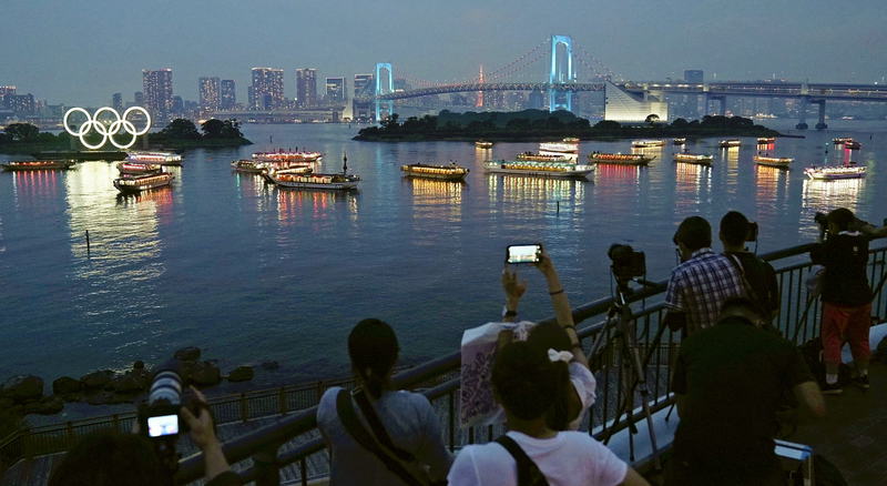 Yakatabune pleasure boats light their lanterns to honor the efforts of medical workers fighting against the novel coronavirus epidemic at Odaiba Marine Park in Minato Ward, Tokyo, on Friday. Pleasure boats are a familiar sight on Tokyo's waterways in the summer, but yakatabune reservations have plummeted this year due to the pandemic. "I can't wait for the coronavirus epidemic to end and the Olympics to start," said yakatabune owner Kenji Niikura, 57.