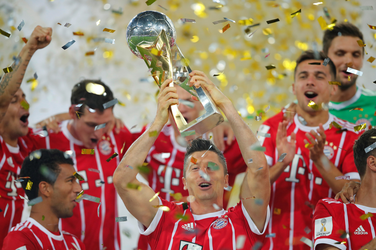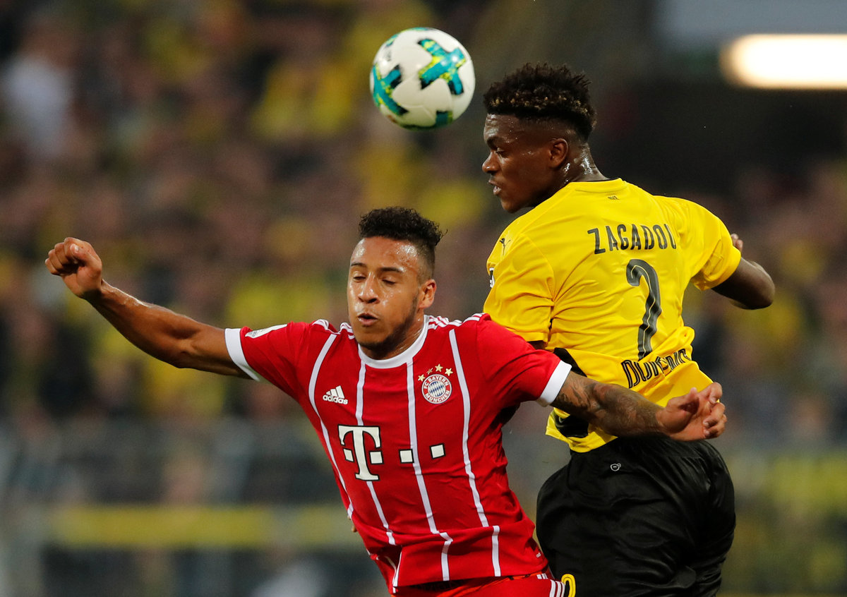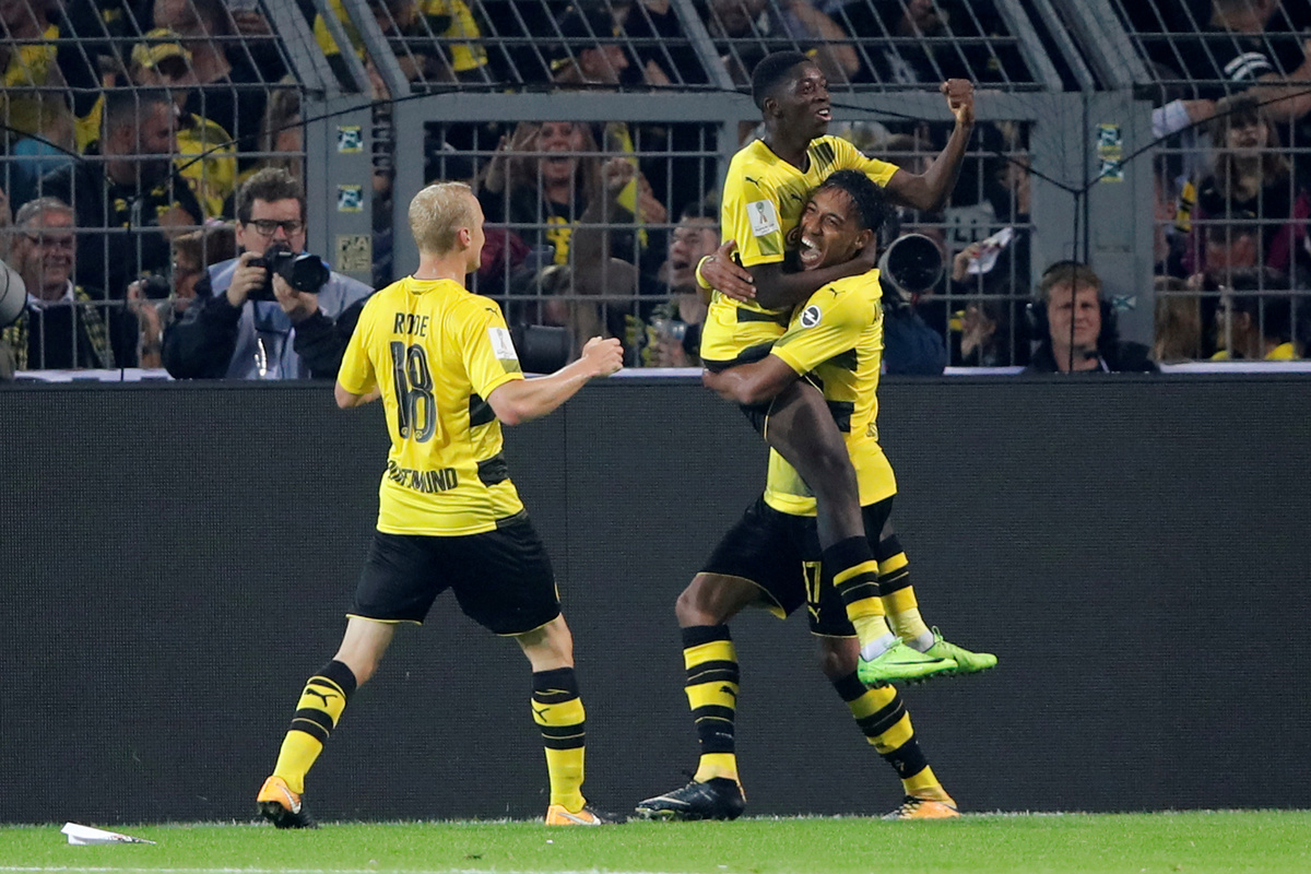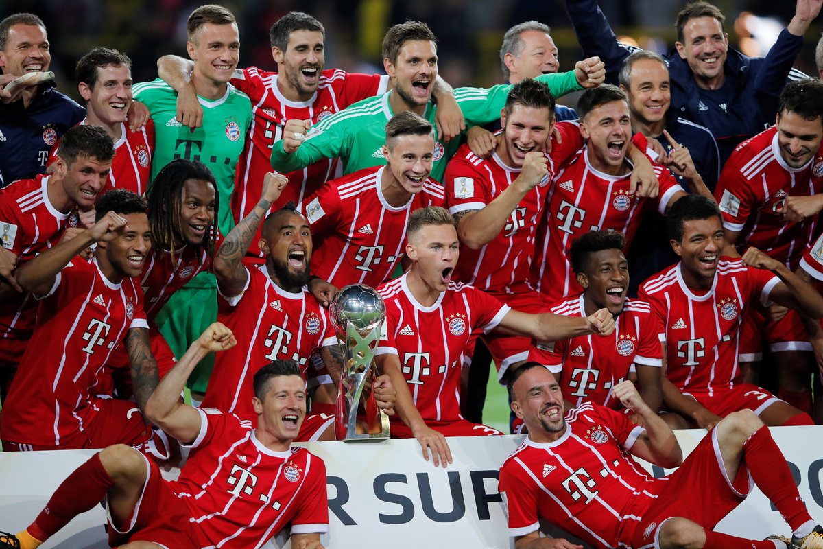 Soccer Football - Borussia Dortmund vs FC Bayern Munich - DFL-Supercup Final - Dortmund, Germany - August 5, 2017 Bayern Munich’s Thomas Muller celebrates with the trophy after winning the DFL-Supercup Final REUTERS/Wolfgang RattaySoccer Football - Borussia Dortmund vs FC Bayern Munich - DFL-Supercup Final - Dortmund, Germany - August 5, 2017 Bayern Munich’s Joshua Kimmich celebrates after scoring their second goal REUTERS/Wolfgang RattaySoccer Football - Borussia Dortmund vs FC Bayern Munich - DFL-Supercup Final - Dortmund, Germany - August 5, 2017 Borussia Dortmund’s Pierre-Emerick Aubameyang celebrates after scoring their second goal with Ousmane Dembele and Sebastian Rode REUTERS/Wolfgang RattaySoccer Football - Borussia Dortmund vs FC Bayern Munich - DFL-Supercup Final - Dortmund, Germany - August 5, 2017 Bayern Munich’s Corentin Tolisso in action against Borussia Dortmund’s Dan-Axel Zagadou REUTERS/Wolfgang Rattay DFL