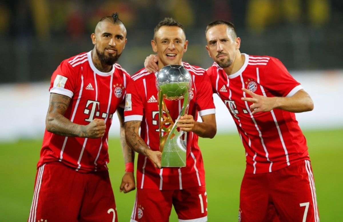Soccer Football - Borussia Dortmund vs FC Bayern Munich - DFL-Supercup Final - Dortmund, Germany - August 5, 2017 Bayern Munich’s Arturo Vidal, Rafinha and Franck Ribery celebrate with the trophy after winning the DFL-Supercup Final REUTERS/Wolfgang Rattay