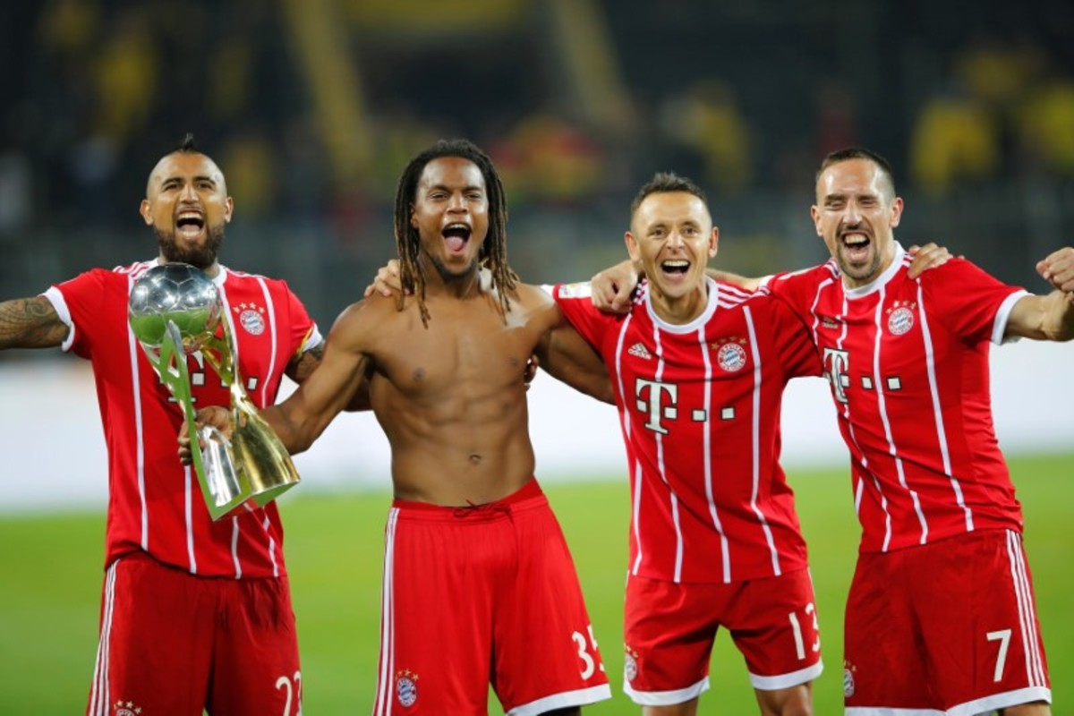 Soccer Football - Borussia Dortmund vs FC Bayern Munich - DFL-Supercup Final - Dortmund, Germany - August 5, 2017 Bayern Munich’s Arturo Vidal, Renato Sanches, Rafinha and Franck Ribery celebrate with the trophy after winning the DFL-Supercup Final REUTERS/Wolfgang Rattay