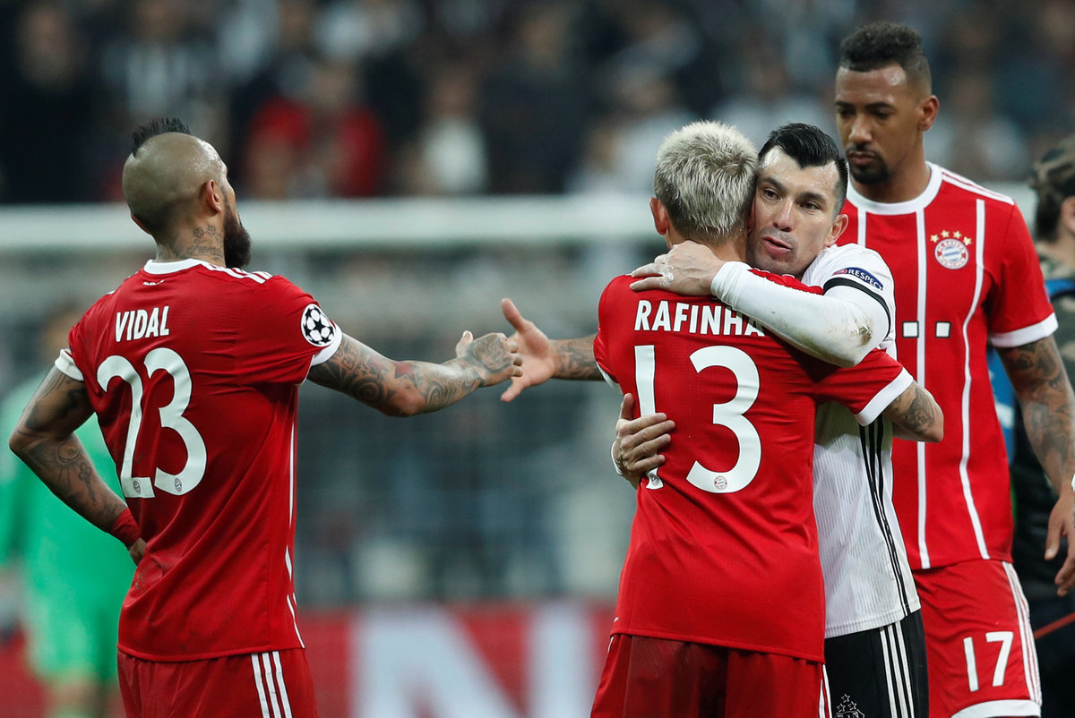 Soccer Football - Champions League Round of 16 Second Leg - Besiktas vs Bayern Munich - Vodafone Arena, Istanbul, Turkey - March 14, 2018 Besiktas' Gary Medel shakes hands with Bayern Munich's Arturo Vidal as he hugs Rafinha after the match REUTERS/Murad Sezer
