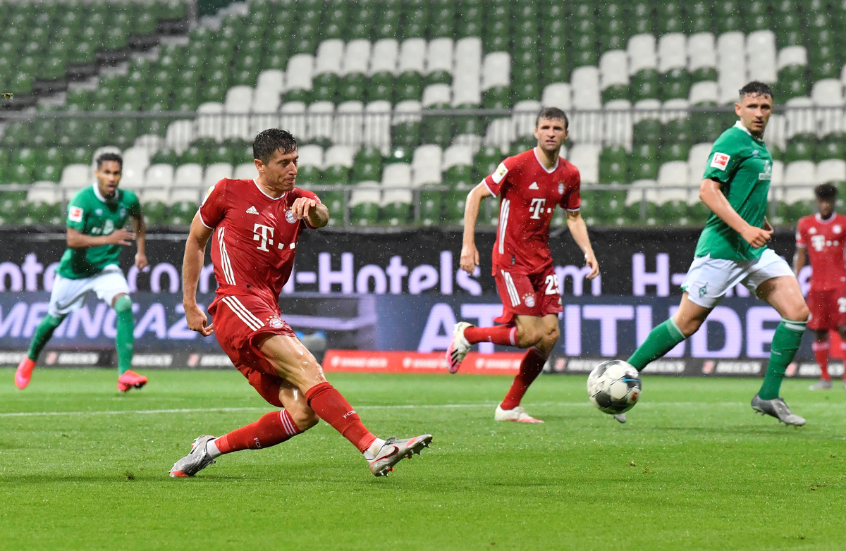 Soccer Football - Bundesliga - Werder Bremen v Bayern Munich - Weser-Stadion, Bremen, Germany - June 16, 2020 Bayern Munich's Robert Lewandowski scores their first goal, following the resumption of play behind closed doors after the outbreak of the coronavirus disease (COVID-19) Martin Meissner/Pool via REUTERS