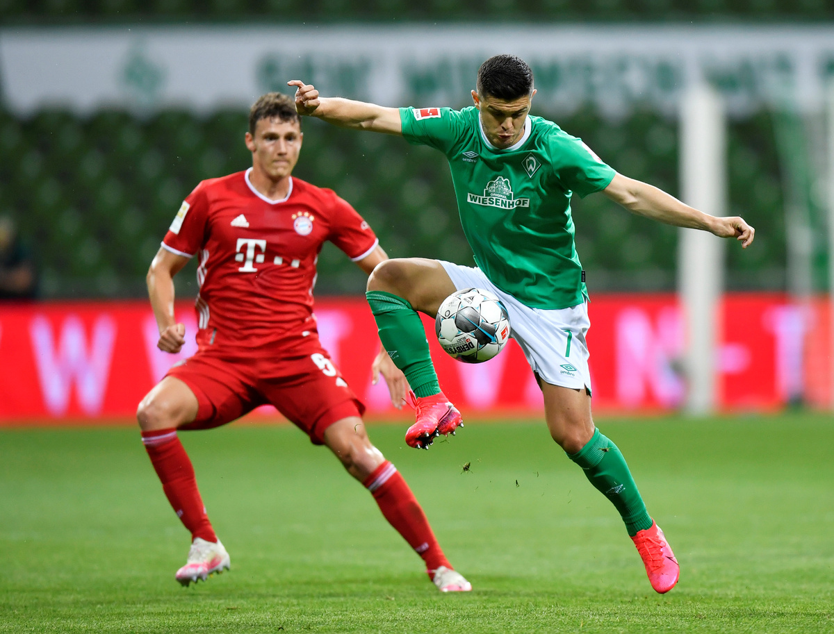 Soccer Football - Bundesliga - Werder Bremen v Bayern Munich - Weser-Stadion, Bremen, Germany - June 16, 2020 Bayern Munich's Benjamin Pavard in action with Werder Bremen's Milot Rashica, following the resumption of play behind closed doors after the outbreak of the coronavirus disease (COVID-19) Martin Meissner/Pool via REUTERS