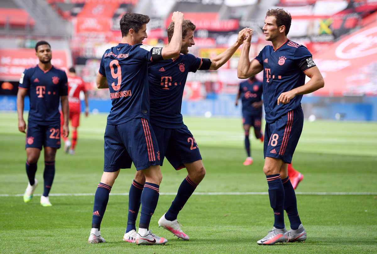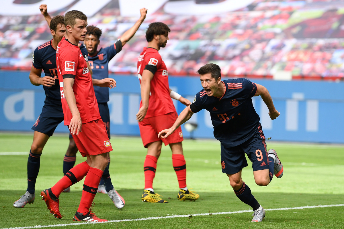Soccer Football - Bundesliga - Bayer Leverkusen v Bayern Munich- BayArena, Leverkusen, Germany - June 6, 2020 Bayer Leverkusen's Alaksandar Dragovic in action with Bayern Munich's Robert Lewandowski and Kingsley Coman, as play resumes behind closed doors following the outbreak of the coronavirus disease (COVID-19) Matthias Hangst/Pool via REUTERS Soccer Football - Bundesliga - Bayer Leverkusen v Bayern Munich- BayArena, Leverkusen, Germany - June 6, 2020 Bayern Munich's Leon Goretzka celebrates scoring their second goal with teammates, as play resumes behind closed doors following the outbreak of the coronavirus disease (COVID-19) Matthias Hangst/Pool via REUTERS Soccer Football - Bundesliga - Bayer Leverkusen v Bayern Munich- BayArena, Leverkusen, Germany - June 6, 2020 Bayern Munich's Robert Lewandowski scores their fourth goal, as play resumes behind closed doors following the outbreak of the coronavirus disease (COVID-19) Matthias Hangst/Pool via REUTERS Soccer Football - Bundesliga - Bayer Leverkusen v Bayern Munich- BayArena, Leverkusen, Germany - June 6, 2020 Bayern Munich's Robert Lewandowski celebrates scoring their fourth goal, as play resumes behind closed doors following the outbreak of the coronavirus disease (COVID-19) Matthias Hangst/Pool via REUTERS