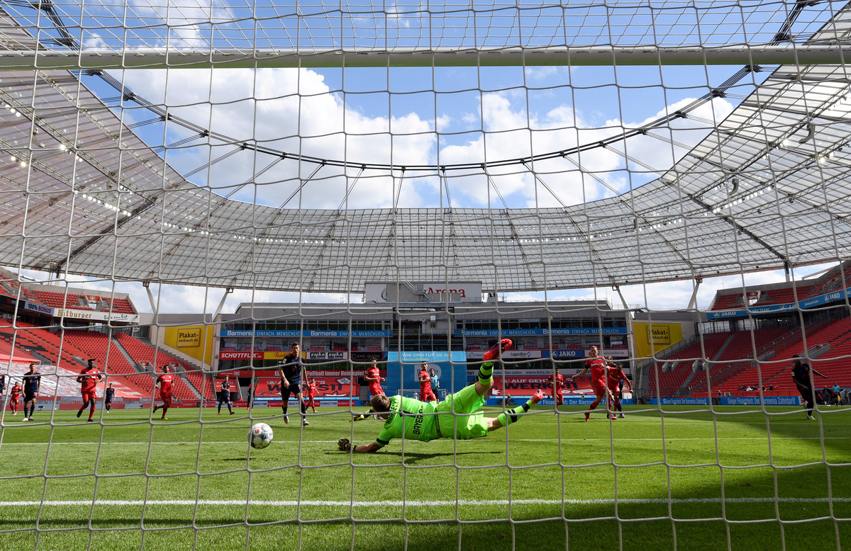 Soccer Football - Bundesliga - Bayer Leverkusen v Bayern Munich- BayArena, Leverkusen, Germany - June 6, 2020 Bayern Munich's Leon Goretzka scores their second goal, as play resumes behind closed doors following the outbreak of the coronavirus disease (COVID-19) Matthias Hangst/Pool via REUTERS DFL regulations prohibit any use of photographs as image sequences and/or quasi-video