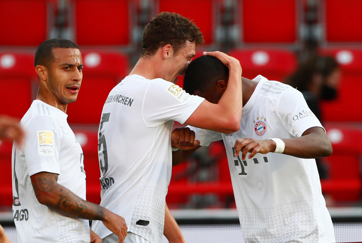 Soccer Football - Bundesliga - 1. FC Union Berlin v Bayern Munich - Stadion An der Alten Forsterei, Berlin, Germany - May 17, 2020 Bayern Munich's Benjamin Pavard celebrates scoring their second goal with teammates, as play resumes behind closed doors following the outbreak of the coronavirus disease (COVID-19) REUTERS/Hannibal Hanschke/Pool