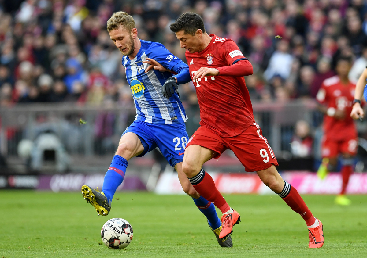 Hertha were left with 10 men when Karim Rekik lost his temper and hit striker Robert Lewandowski in the 84th minute following a challenge outside the Hertha box.