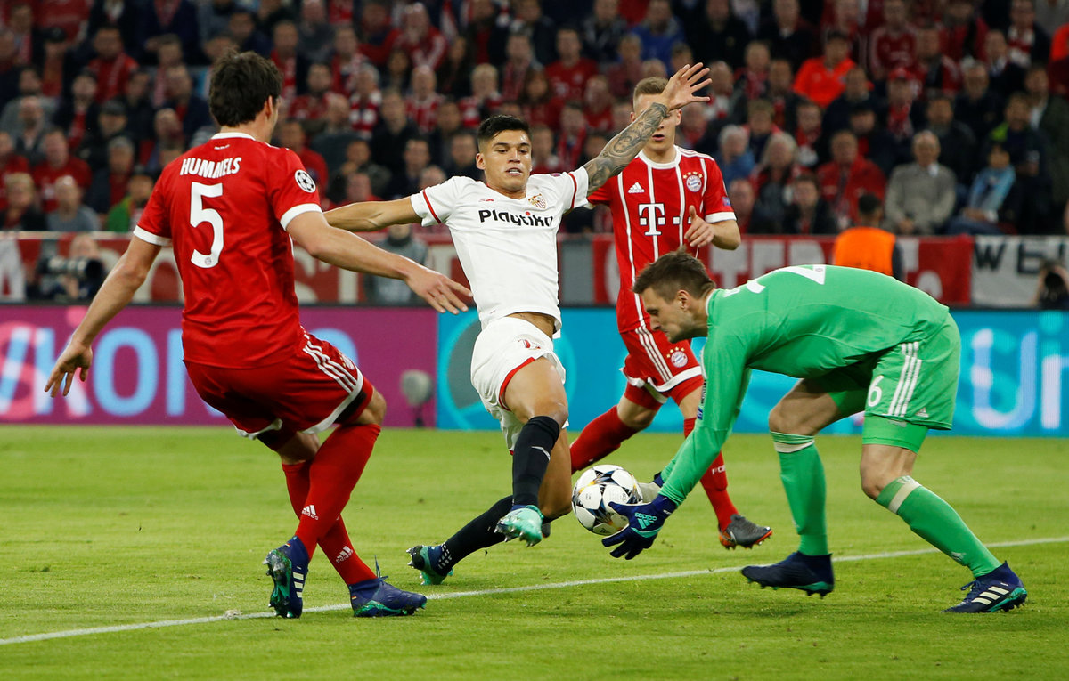 Soccer Football - Champions League Quarter Final Second Leg - Bayern Munich vs Sevilla - Allianz Arena, Munich, Germany - April 11, 2018 Sevilla's Joaquin Correa in action with Bayern Munich's Sven Ulreich and Mats Hummels REUTERS/Michaela Rehle