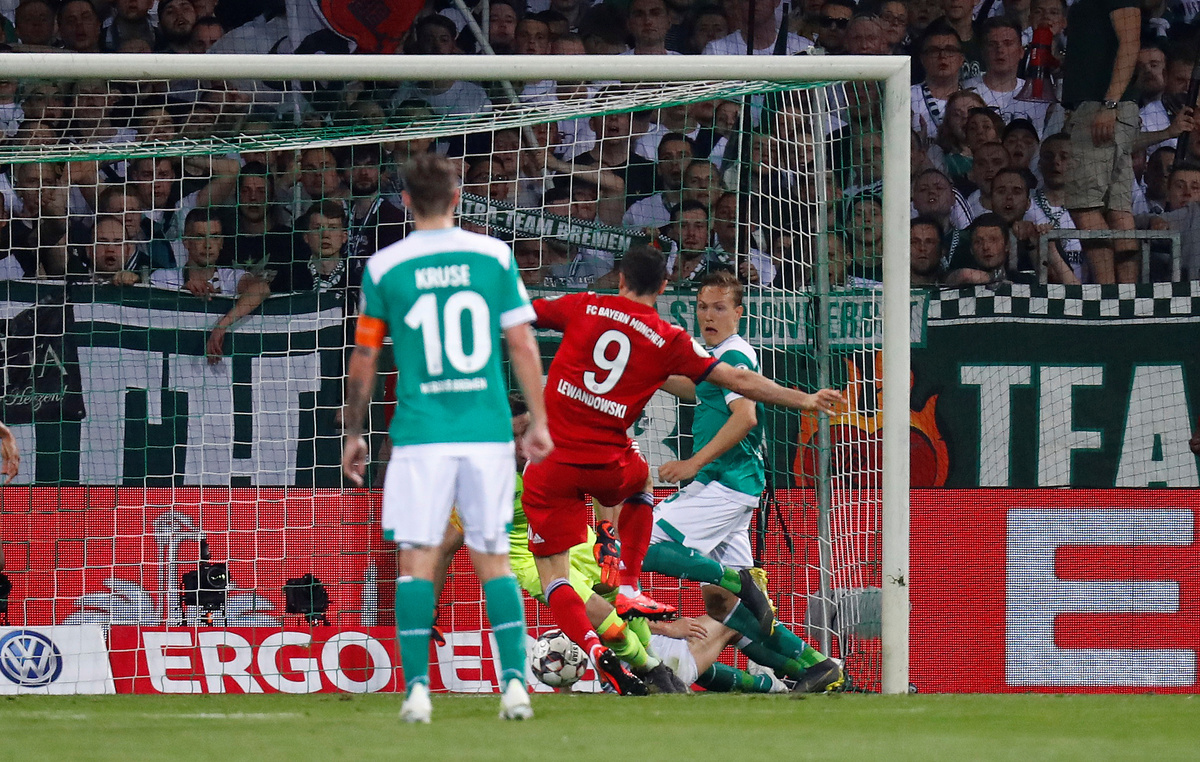 Lewandowski, however, silenced the home crowd with his spot kick, which was awarded for a foul on Kingsley Coman by Theodor Gebre Selassie that left the Bremen players furious with the decision.