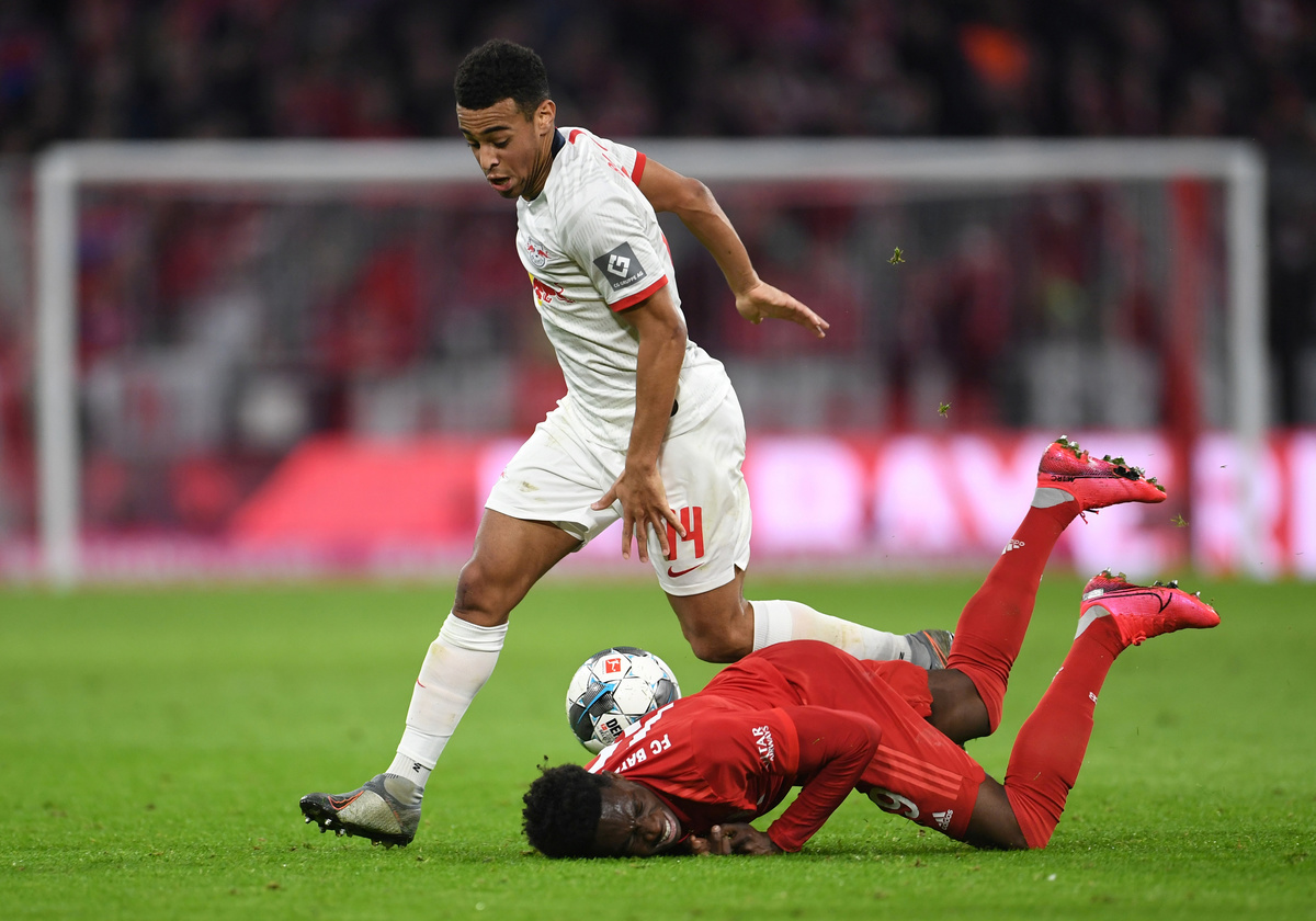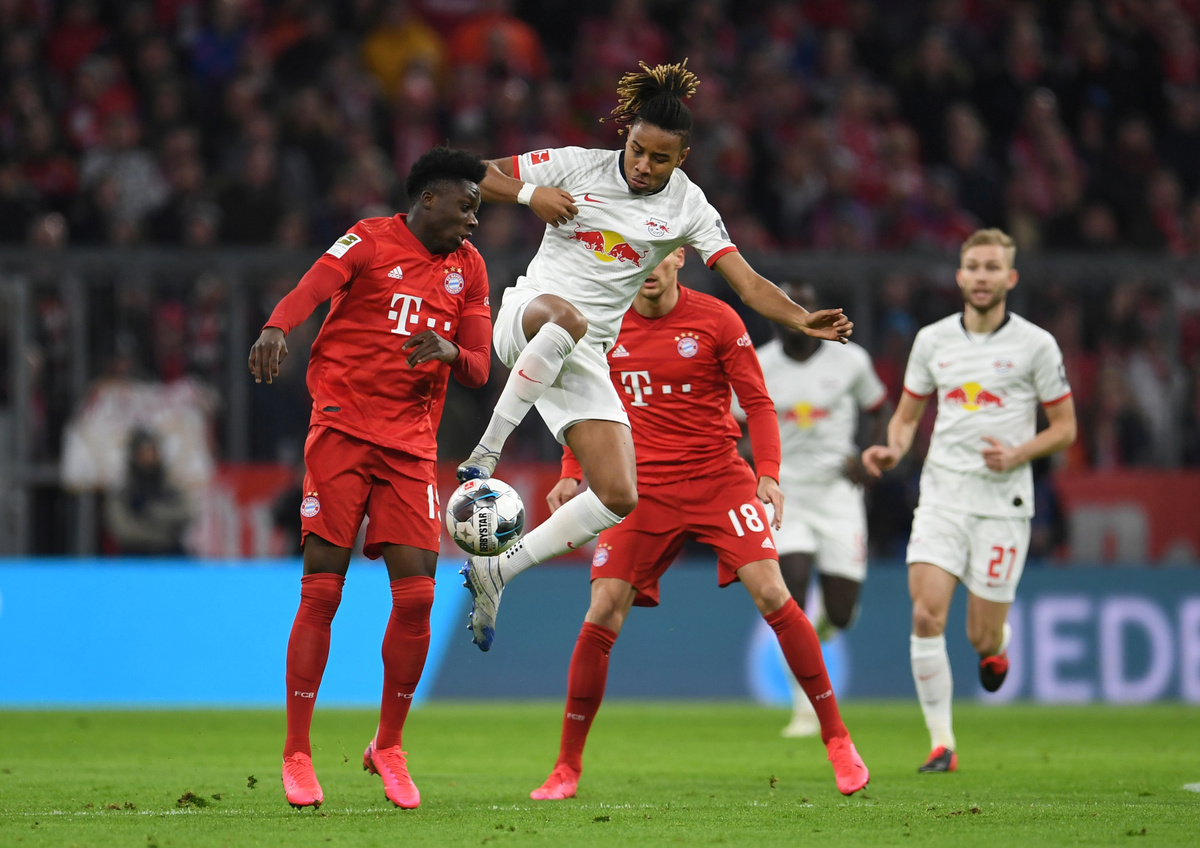 Soccer Football - Bundesliga - Bayern Munich v RB Leipzig - Allianz Arena, Munich, Germany - February 9, 2020 RB Leipzig's Christopher Nkunku in action with Bayern Munich's Alphonso Davies REUTERS/Andreas Gebert DFL regulations prohibit any use of photographs as image sequences and/or quasi-video