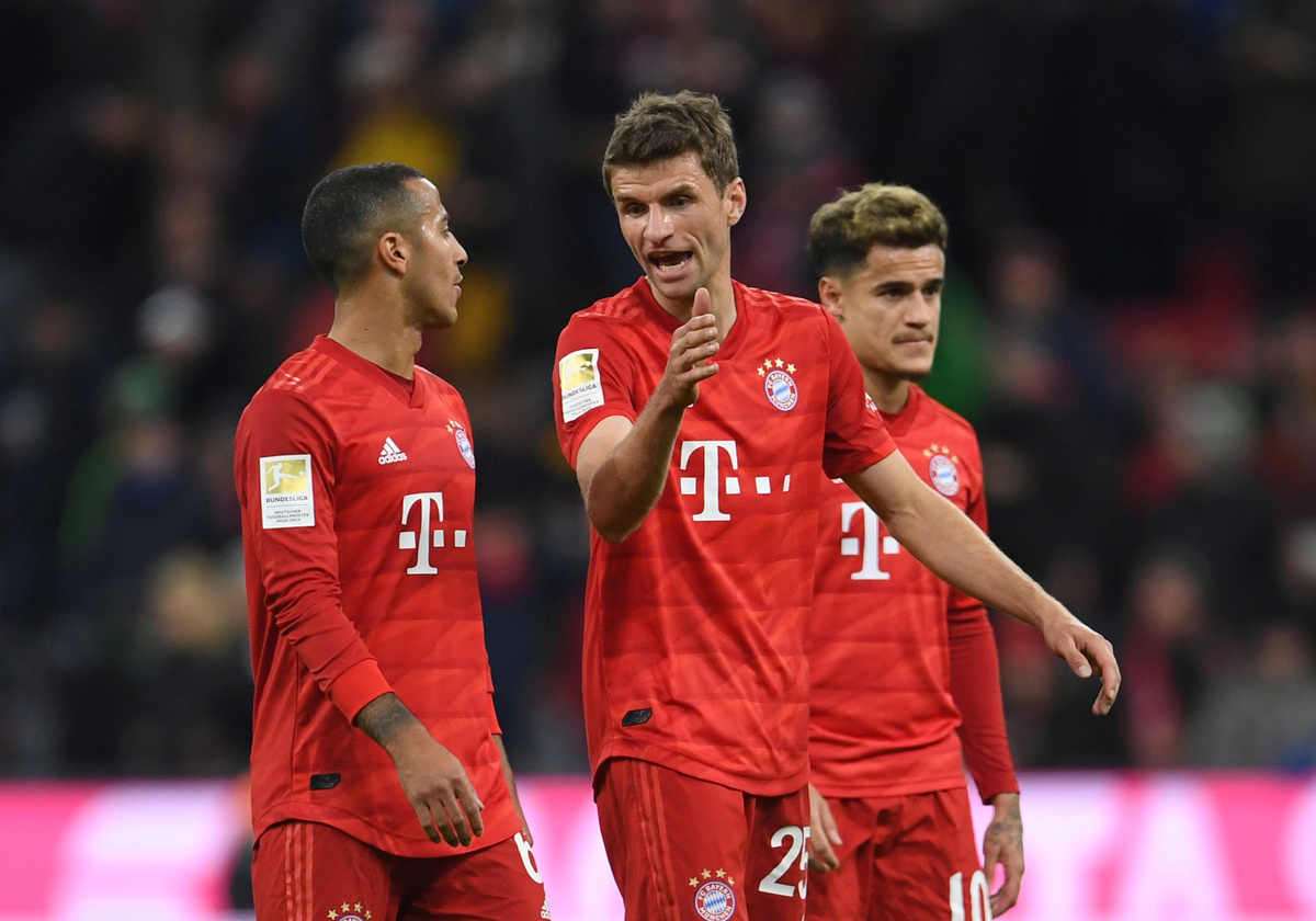 Soccer Football - Bundesliga - Bayern Munich v RB Leipzig - Allianz Arena, Munich, Germany - February 9, 2020 Bayern Munich's Thiago and Thomas Muller after the match REUTERS/Andreas Gebert DFL regulations prohibit any use of photographs as image sequences and/or quasi-video