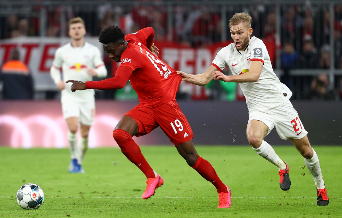 Soccer Football - Bundesliga - Bayern Munich v RB Leipzig - Allianz Arena, Munich, Germany - February 9, 2020 Bayern Munich's Alphonso Davies in action with RB Leipzig's Konrad Laimer REUTERS/Kai Pfaffenbach DFL regulations prohibit any use of photographs as image sequences and/or quasi-video