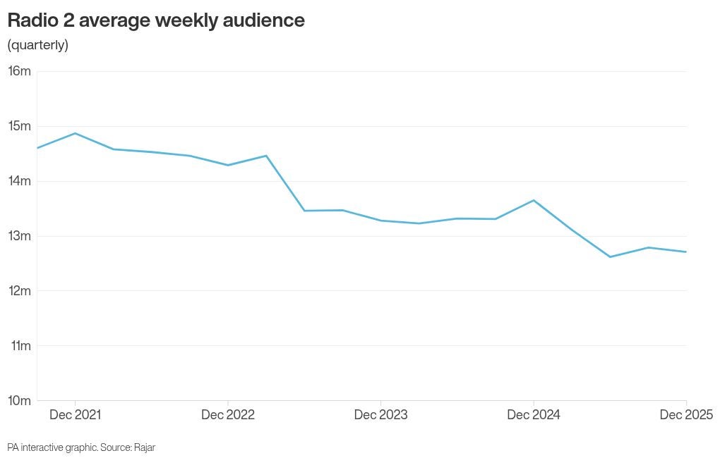 The latest Rajar figures also show that audiences for the commercial radio station Greatest Hits have dropped 20% in a year, from 7.37 million in October-December 2024 to 5.91 million in October-December 2025.