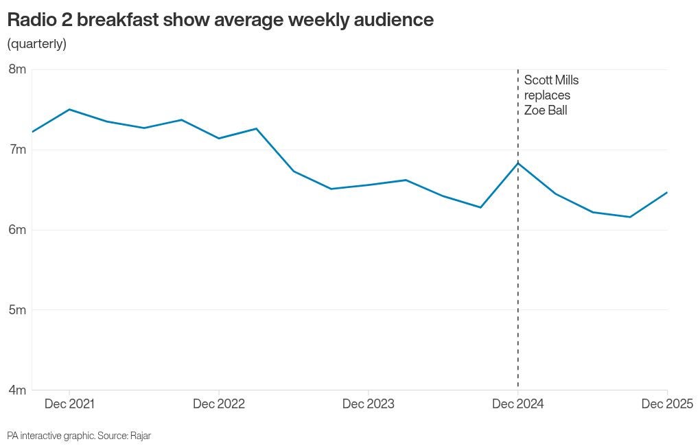 Scott Mills had an average weekly audience of 6.47 million in October-December, up from 6.16 million the previous quarter and his highest figure since taking over the Radio 2 breakfast show in early 2025.