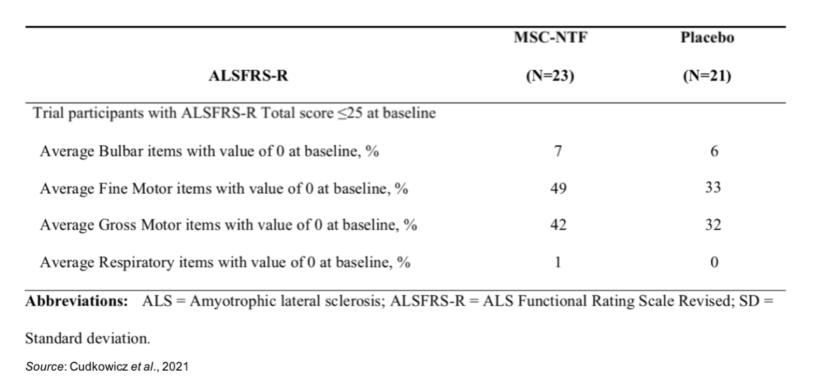 The baseline characteristics for participants in the trial were similar for treated and control groups. The average ALSFRS-R score was 31 and included a number of participants with advanced disease (ALSFRS-R ≤ 25). The following table shows that some participants had a value of zero on ALSFRS-R individual items, thus it wasn't possible to show disease progression on those items.