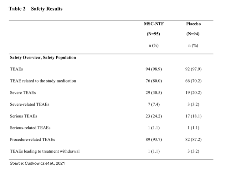 NurOwn treatment was generally well tolerated and almost all participants experienced mild-to-moderate treatment emergent adverse events (TEAEs). The following table shows the incidence of TEAEs, with most being associated with pain having to do with the treatment administration lumbar puncture procedure. Only one participant in each treatment group had a related serious AE (SAE) and there were more withdrawals due to TEAEs in the placebo group. Importantly, there were no clinically significant differences between the treatment groups nor in clinical laboratory values, vital signs, physical examination findings, and ECG results. Sixteen participants died following randomization to treatment, however no deaths were related to study treatment by the investigator.