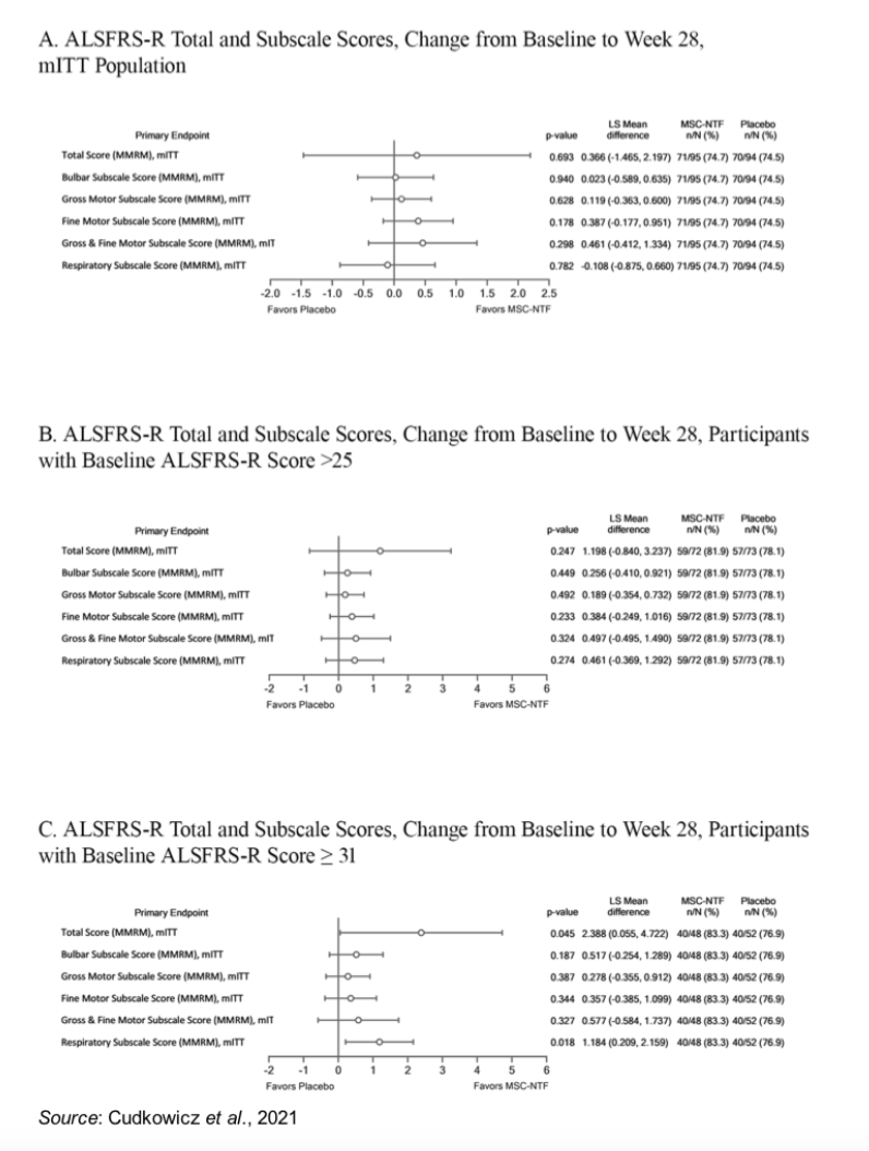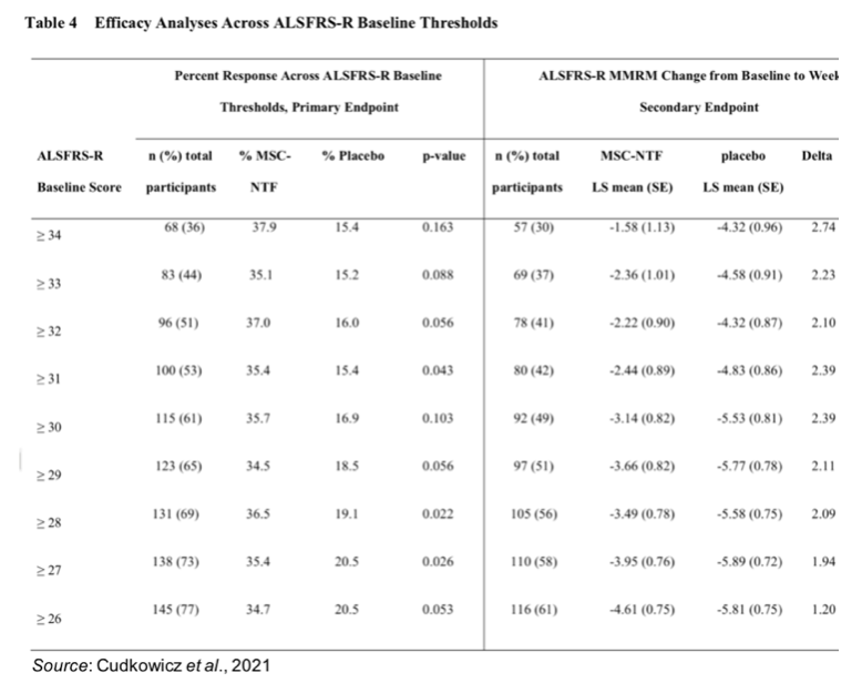 • A pre-specified subgroup analysis of participants with ALSFRS-R scores ≥ 35 showed that 34.6% responded in the NurOwn group compared to 15.6% in the placebo group (P=0.29).