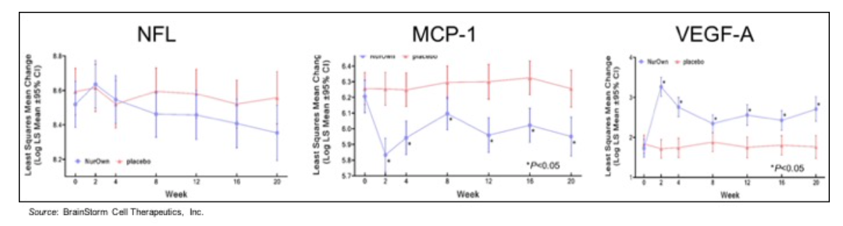 The following graphs show the change in three separate biomarkers in participants administered NurOwn (blue line) or placebo (red line). The biomarkers shown are from the cerebrospinal fluid (CSF) and represent those associated with neurodegeneration (NFL), neuroinflammation (MCP-1), and neuroprotection (VEGF-A). At Week 20, there was a two-fold increase in VEGF-A in patients treated with NurOwn while VEGF-A in patients treated with placebo remain unchanged. MCP-1 was 74% of placebo values in NurOwn-treated patients at Week 20. NFL was 84% of placebo values in NurOwn-treated patients at Week 20.
