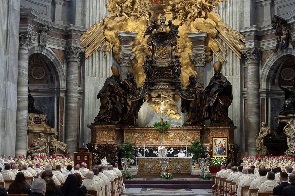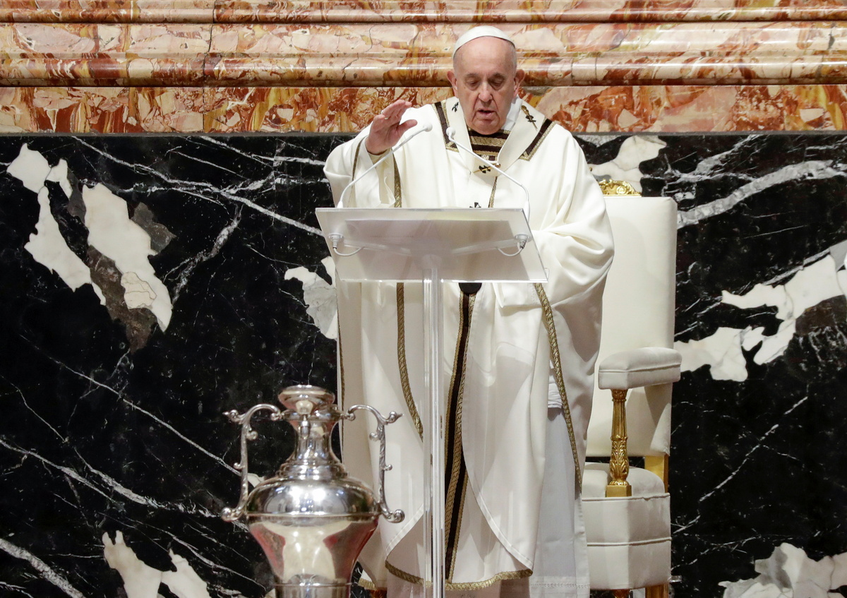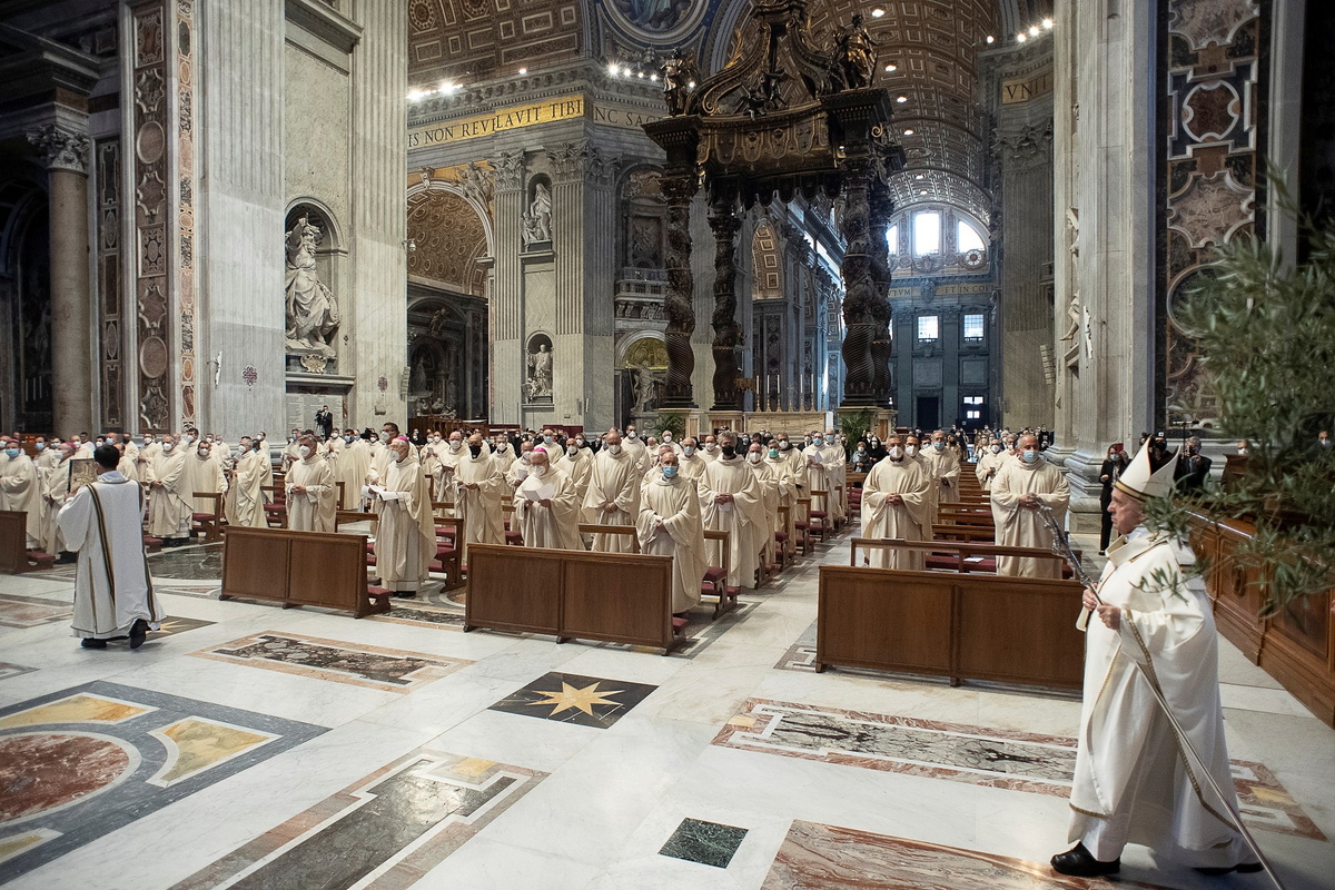 The pope, leader of the 1.3 billion Roman Catholic Church, said the Mass of the Chrism in a secondary part of St. Peter's Basilica for about 200 people instead of the nearly 10,000 in the past.