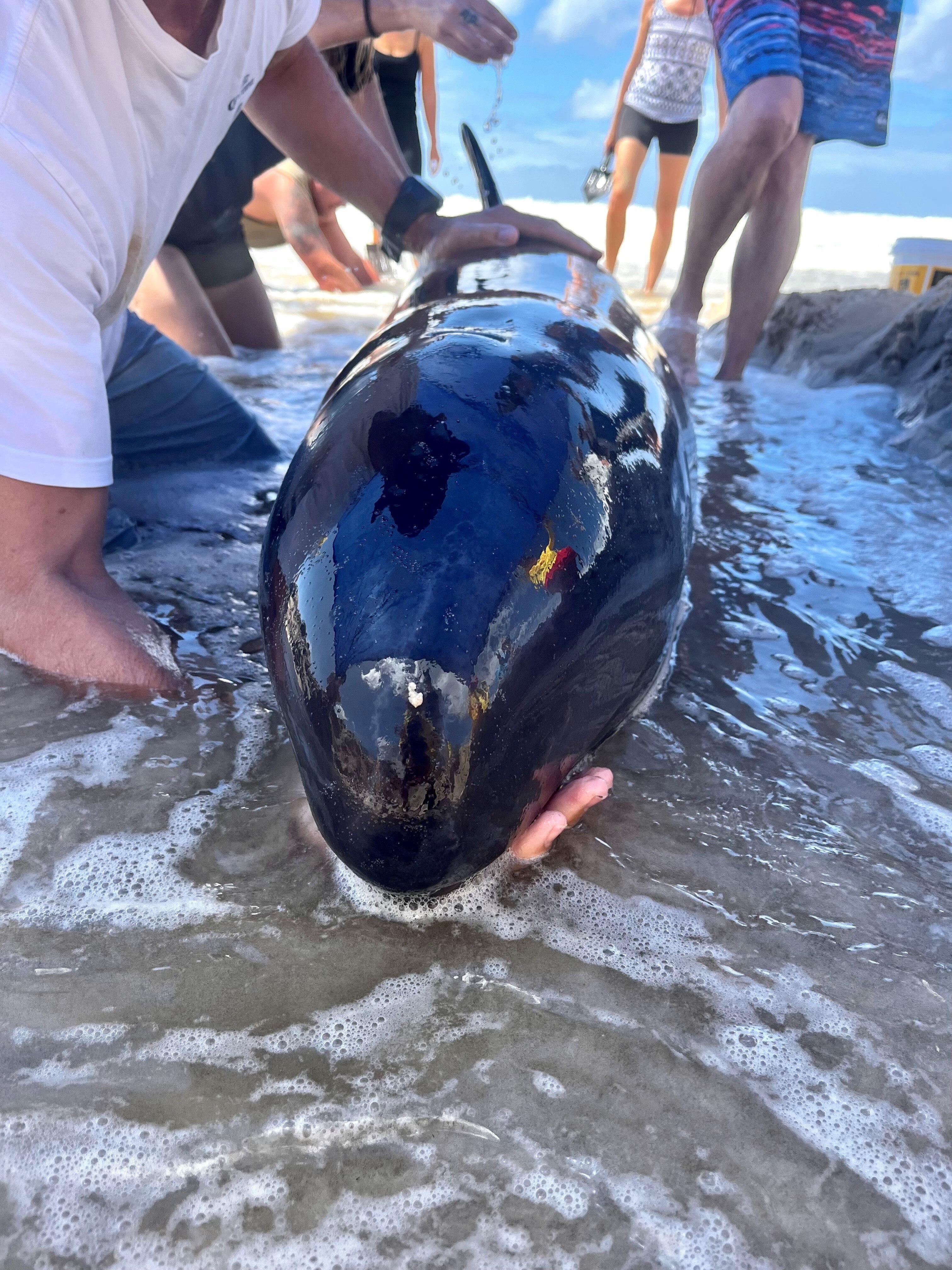 A day at the beach turned into a rescue mission for members of the public who rallied to save a young false killer washed ashore on a beach at Casuarina in northern New South Wales early on Sunday.