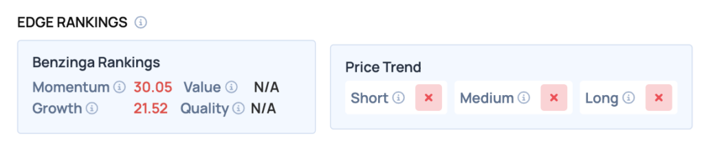 Benzinga Edge Rankings: Benzinga Edge stock rankings give the company a Momentum score of 30.05 and a Growth score of 21.52.