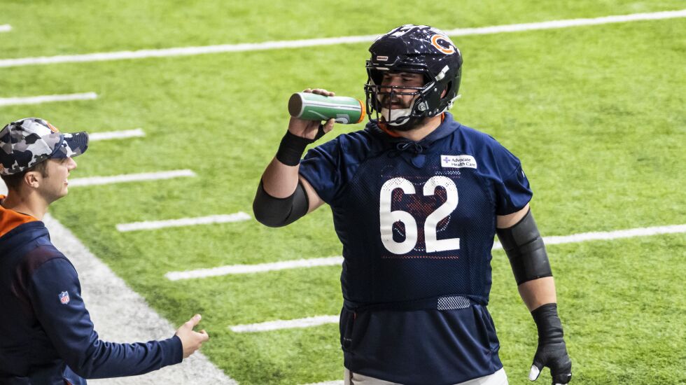 Right tackle Larry Borom is in concussion protocol, too. He did not participate in the Bears’ walk-though Wednesday.