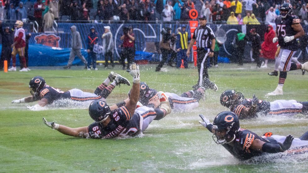Led by quarterback Justin Fields, Bears players slid head-first past the goalposts and into an absolutely soaked end zone in celebration.