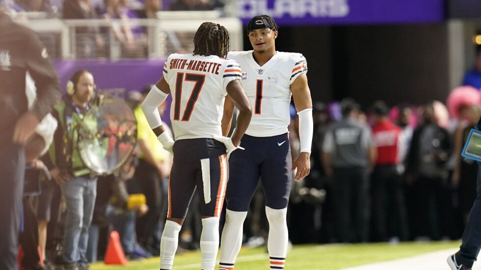 Smith-Marsette was claimed at the start of the regular season after being cut by the Vikings, who drafted him in Round 5 in 2021. Playing against his former team in Week 5, Smith-Marsette caught a pass from Justin Fields at the Vikings’ 39-yard line, down a touchdown. Rather than step out of bounds, he fought for more yards — and was stripped by cornerback Cameron Dantzler to seal the loss with about a minute to play.