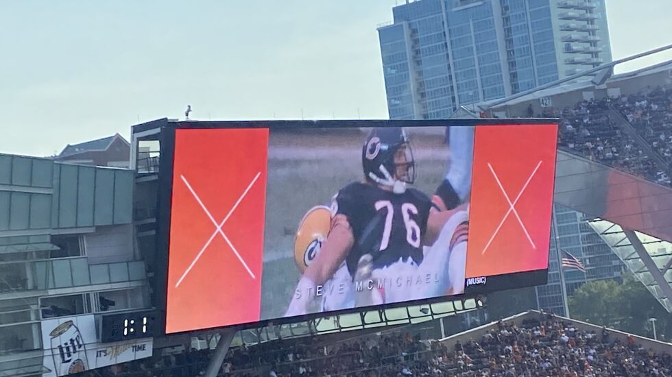 The Bears honored Steve McMichael, who is headed toward the Pro Football Hall of Fame while fighting ALS, during halftime of their season opener against the Packers. At the end of a video montage of famous alumni, the Bears aired clips of some of McMichael’s most impactful plays.